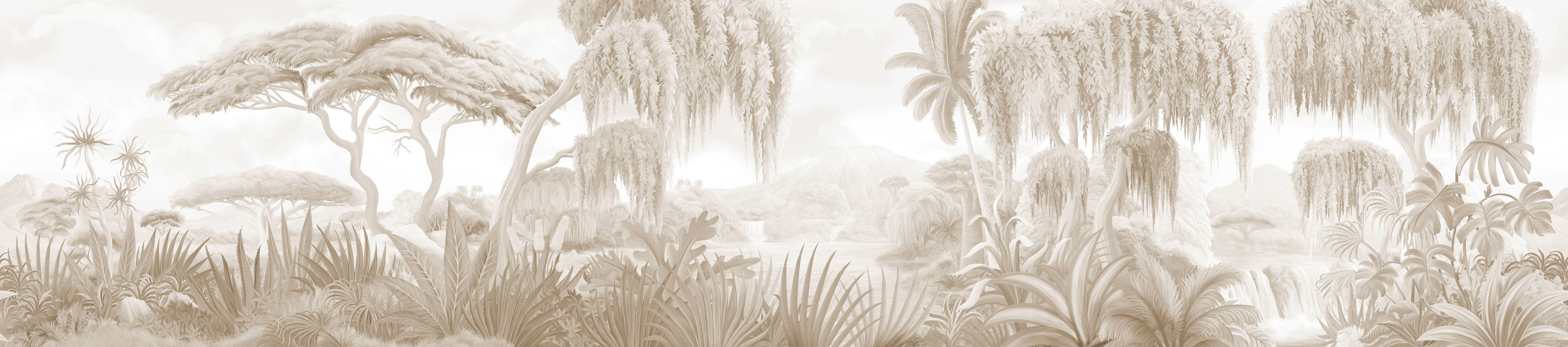 Mural London Art Bon Voyage Les Plaines Sauvages BNV01 D zachwyca subtelną elegancją i ciepłą, wyciszoną paletą barw. Przedstawia egzotyczny krajobraz, w którym misternie splecione konary drzew delikatnie rysują się na tle odległych wzgórz. Roślinność o miękkich, falujących kształtach buduje wrażenie lekkości, a wielowarstwowa kompozycja wzbogaci wnętrze o głębię i przestronność. Neutralne odcienie beżu tworzą atmosferę harmonii i wyrafinowania, dzięki czemu mural doskonale odnajdzie się w aranżacjach inspirowanych naturą. Dekoracja płynnie zintegruje się z eklektycznymi i minimalistycznymi wnętrzami, podkreślając szlachetność drewna, lnu i kamienia. Stonowana kolorystyka sprawia, że wzór nabiera uniwersalnego charakteru, a subtelna gra światła i cienia podkreśla organiczny rytm kompozycji. Mural London Art BNV01 A Bon Voyage Les Plaines Sauvages stworzy spójną, kojącą przestrzeń, w której egzotyka przeplata się z ponadczasową estetyką.