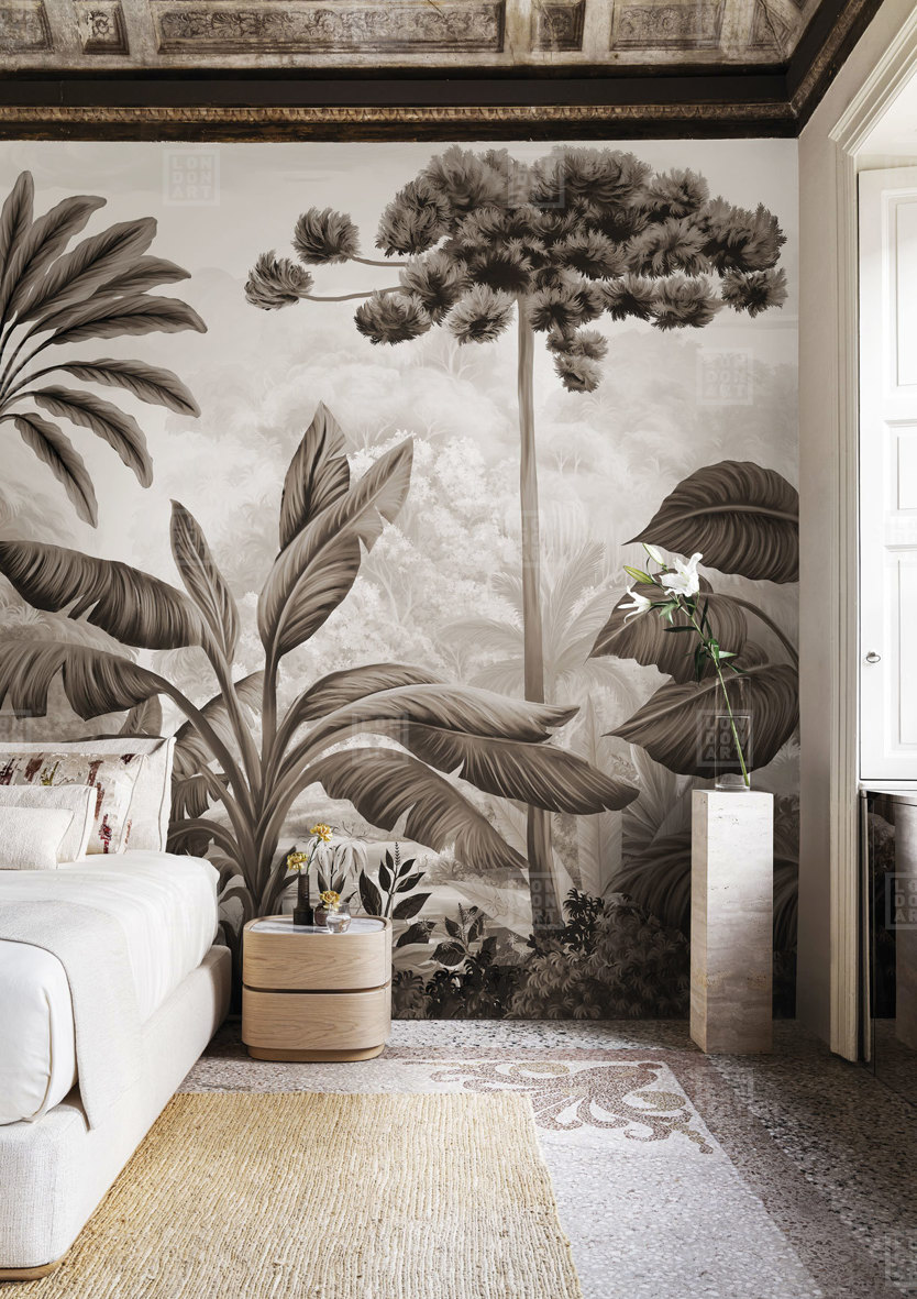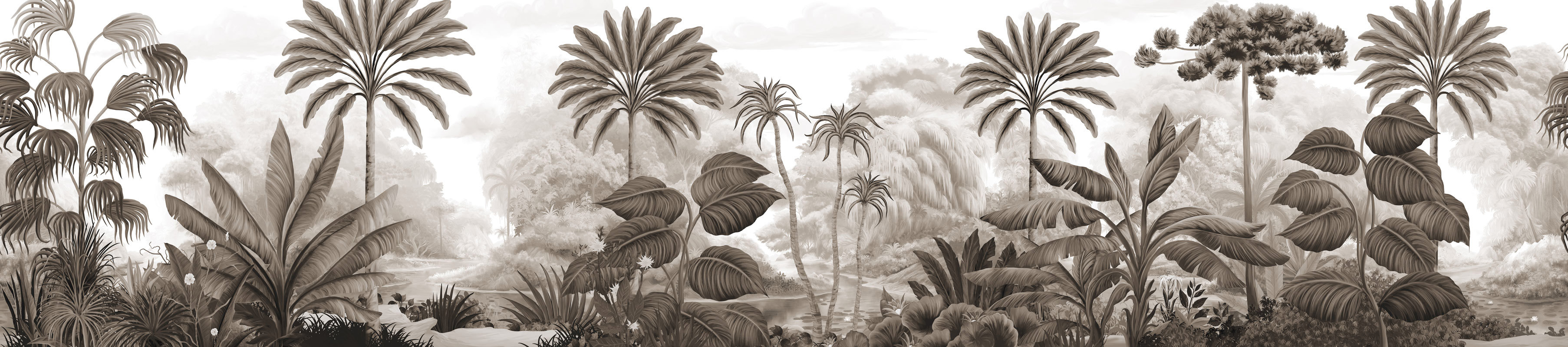 Mural London Art Bon Voyage L'Âme Amazonienne BNV03 D przedstawia tropikalny las pełen bujnej roślinności, gdzie smukłe palmy i szerokie liście tworzą spokojny, naturalny pejzaż. Rozproszone światło i miękkie kontury dodadzą kompozycji lekkości, tworząc wrażenie głębi i harmonii. Odcienie ciepłych beży i brązów podkreślają subtelny, elegancki charakter dekoracji, która wprowadzi do wnętrza atmosferę sprzyjającą relaksowi. Mural London Art BNV03 D Bon Voyage L'Âme Amazonienne sprawdzi się w salonie, jadalni, gabinecie czy sypialni. Naturalna kolorystyka pozwala na łatwe dopasowanie do drewnianych mebli, lnianych tkanin i kamiennych wykończeń.