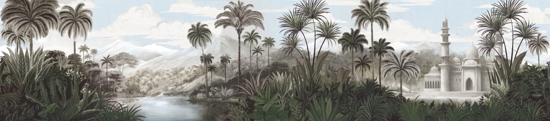 Mural London Art Bon Voyage Les Rêves Orientaux BNV05 A przedstawia egzotyczny pejzaż, w którym gęsta roślinność otacza spokojne wody rzeki, a w tle wznosi się majestatyczna, orientalna budowla. Smukłe sylwetki palm i tropikalnych roślin budują wielowarstwową kompozycję, która doda wnętrzu głębi i przestronności. Góry skąpane w delikatnej mgiełce wzmacniają efekt harmonii i tajemniczości. Ciepłe odcienie zieleni i beżu przełamane błękitem nieba tworzą relaksującą atmosferę. Mural London Art BNV05 A Bon Voyage Les Rêves Orientaux doskonale sprawdzi się w salonie, jadalni, gabinecie lub sypialni. Naturalna kolorystyka pięknie współgra z drewnem, lnianymi tkaninami i detalami w złocie lub mosiądzu. Wzór optycznie powiększy wnętrze i wprowadzi do niego nutę orientalnej elegancji.