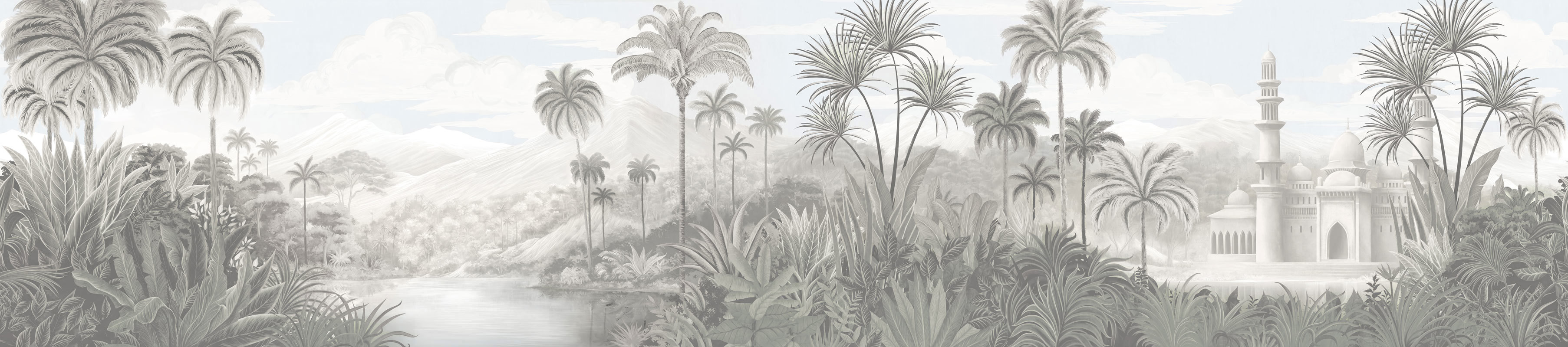 Mural London Art Bon Voyage Les Rêves Orientaux BNV05 B przedstawia malowniczy, egzotyczny krajobraz, w którym bujna roślinność i smukłe palmy otaczają spokojną rzekę. W oddali wyłania się majestatyczna, orientalna budowla spowita lekką mgłą, która dodaje kompozycji tajemniczego i harmonijnego charakteru. Neutralna paleta barw w odcieniach beżu, szarości i złamanej bieli wprowadzi do wnętrza atmosferę pełną spokoju i elegancji. Mural London Art BNV05 B Bon Voyage Les Rêves Orientaux doskonale sprawdzi się w salonie, jadalni, gabinecie lub sypialni. Przełamie monotonię aranżacji i optycznie powiększy przestrzeń. Jego delikatna estetyka świetnie współgra z naturalnym drewnem, lnianymi tkaninami i detalami w odcieniach złota lub mosiądzu.