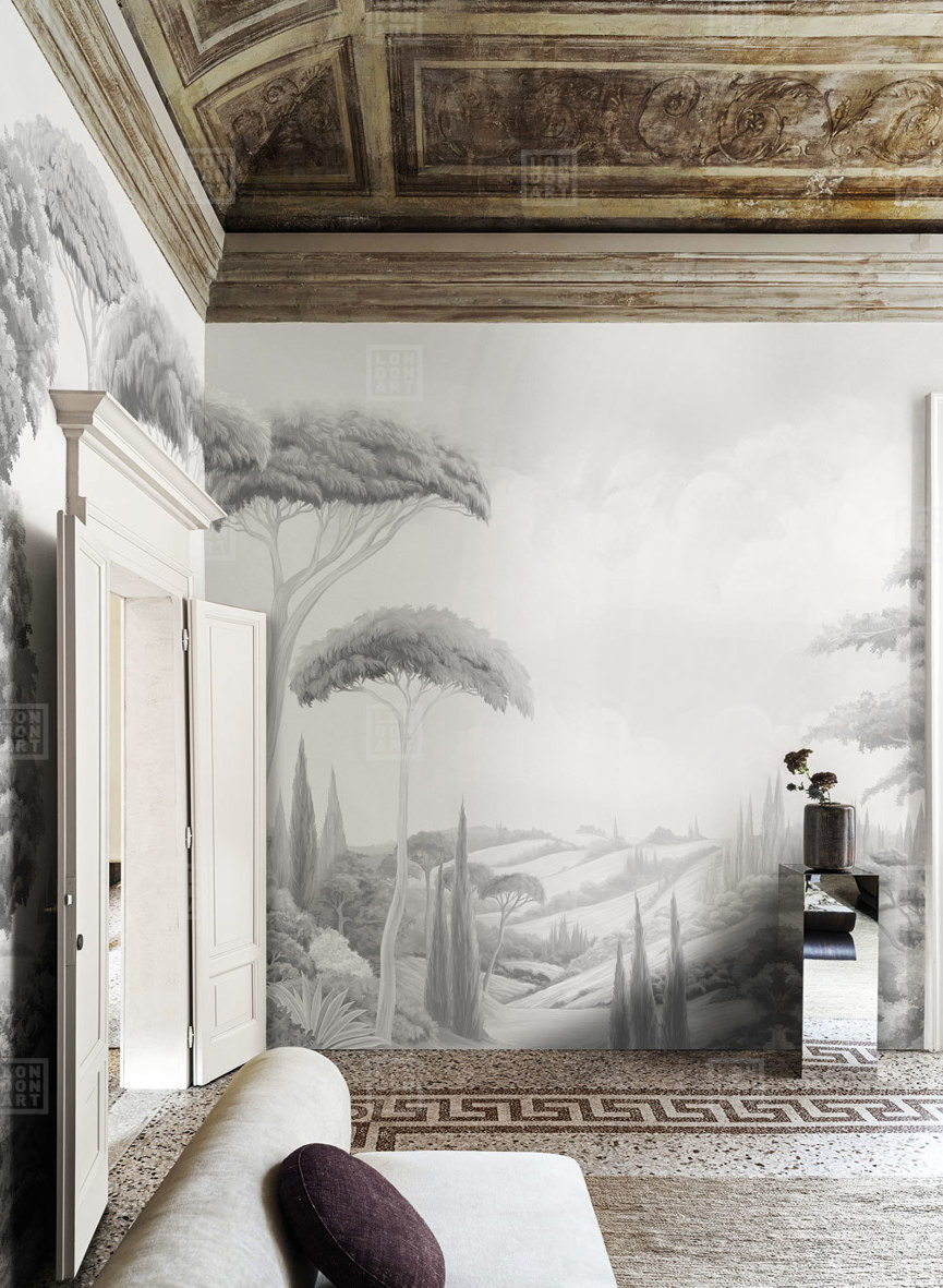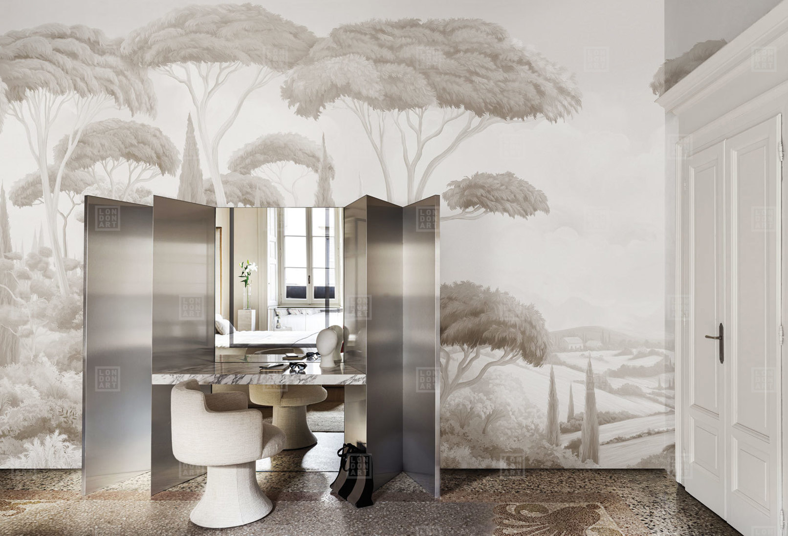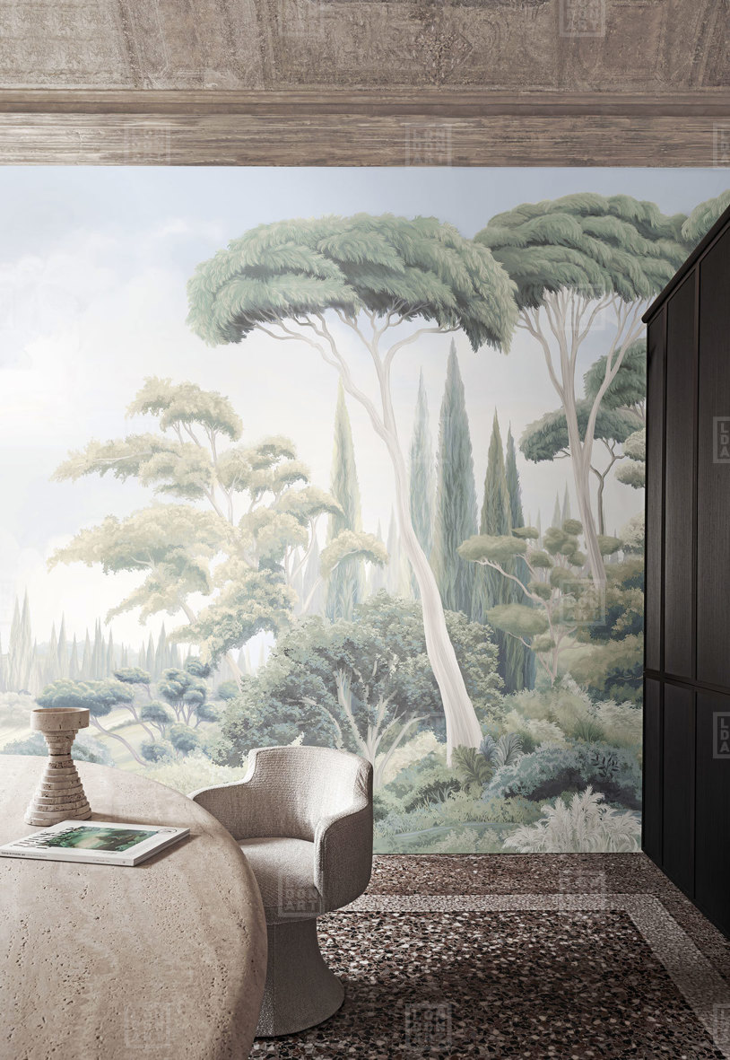 Mural London Art Bon Voyage Le Cœur Méditerranéen BNV08 C przedstawia idylliczny krajobraz inspirowany śródziemnomorską naturą. Smukłe sosny pinie o rozłożystych koronach tworzą lekką, harmonijną kompozycję. Zróżnicowana roślinność nadaje scenerii głębię i naturalność. Jasna paleta barw wprowadzi do wnętrza atmosferę pełną spokoju i elegancji. Mural London Art BNV08 C Bon Voyage Le Cœur Méditerranéen doskonale pasuje do salonu, sypialni czy jadalni, gdzie stworzy efekt otwartego krajobrazu. Świetnie komponuje się z drewnianymi meblami, jasnymi tekstyliami i rattanowymi dodatkami - stworzy z tymi elementami wyposażenia przestrzeń inspirowaną śródziemnomorskim stylem życia.