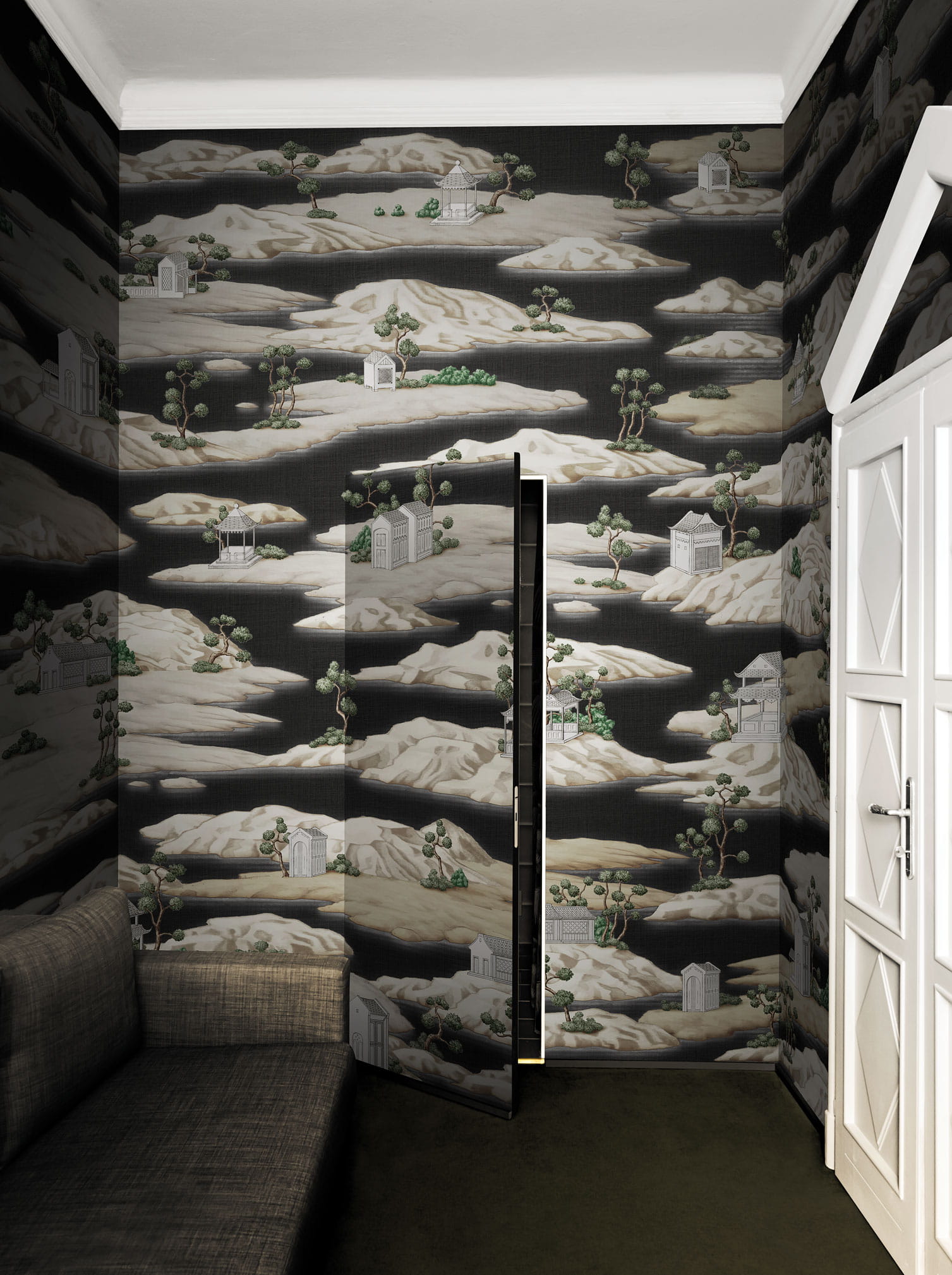 Mural London Art Kimono KMN09 C Yukata przedstawia samotność pejzażu, świadectwo głębokiej jedności człowieka z naturą oraz melancholijną wizję świata. Sposób ułożenia pojedynczych domów oraz drzew na małych wyspach zachwyca i bardzo ciekawi. Model wprowadza do wnętrza tajemniczość, pozostawia stan ducha w zastanowieniu nad symboliką tego obrazu. W całej kolekcji jest to najbardziej interesująca kompozycja ścienna. Świetnie sprawdzi się w gabinecie, salonie oraz przedpokoju urządzonym w klasycznym stylu. Mural London Art Kimono KMN09 C Yukata dostępny jest w pięciu wariantach kolorystycznych.