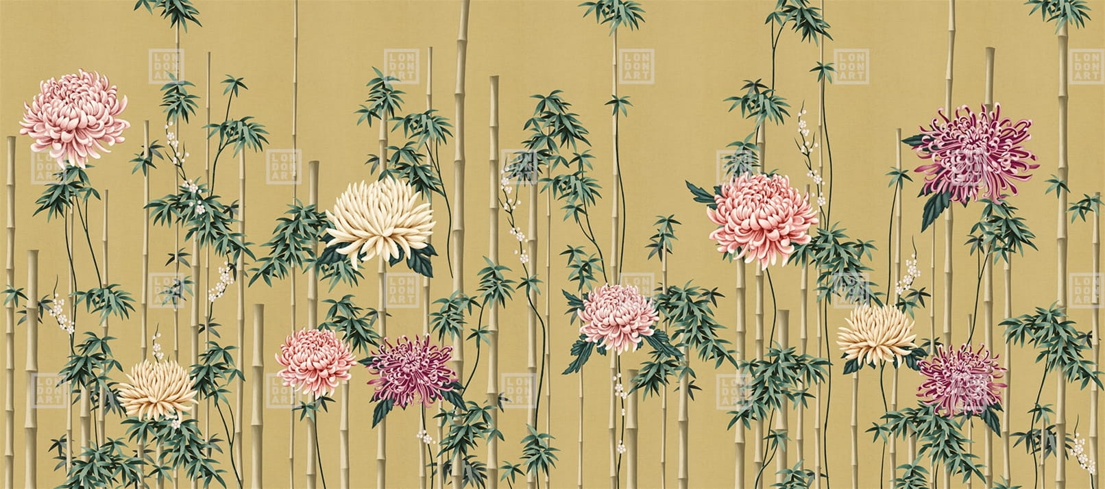 Mural London Art Kimono KMN10 A Fuki prezentuje las bambusowy z nieoczywistymi, kwitnącymi chryzantemami. W Japonii aranżacja kwiatów musi dawać poczucie równowagi i harmonii, zgodnie z otaczającym środowiskiem. Badane są kolory i kształty, tworzony jest taniec, który może wzbudzić doznania i uczucia. Na tym modelu bambus i chryzantema występują naprzemiennie, reprezentując nieśmiertelność, ponieważ rodząc się jesienią, stawiają czoła przeciwnościom zimna. Motyw doskonale sprawdzi się w stylu glamour oraz nowoczesnym. Mural London Art Kimono KMN10 A Fuki dostępny jest w pięciu wariantach kolorystycznych.