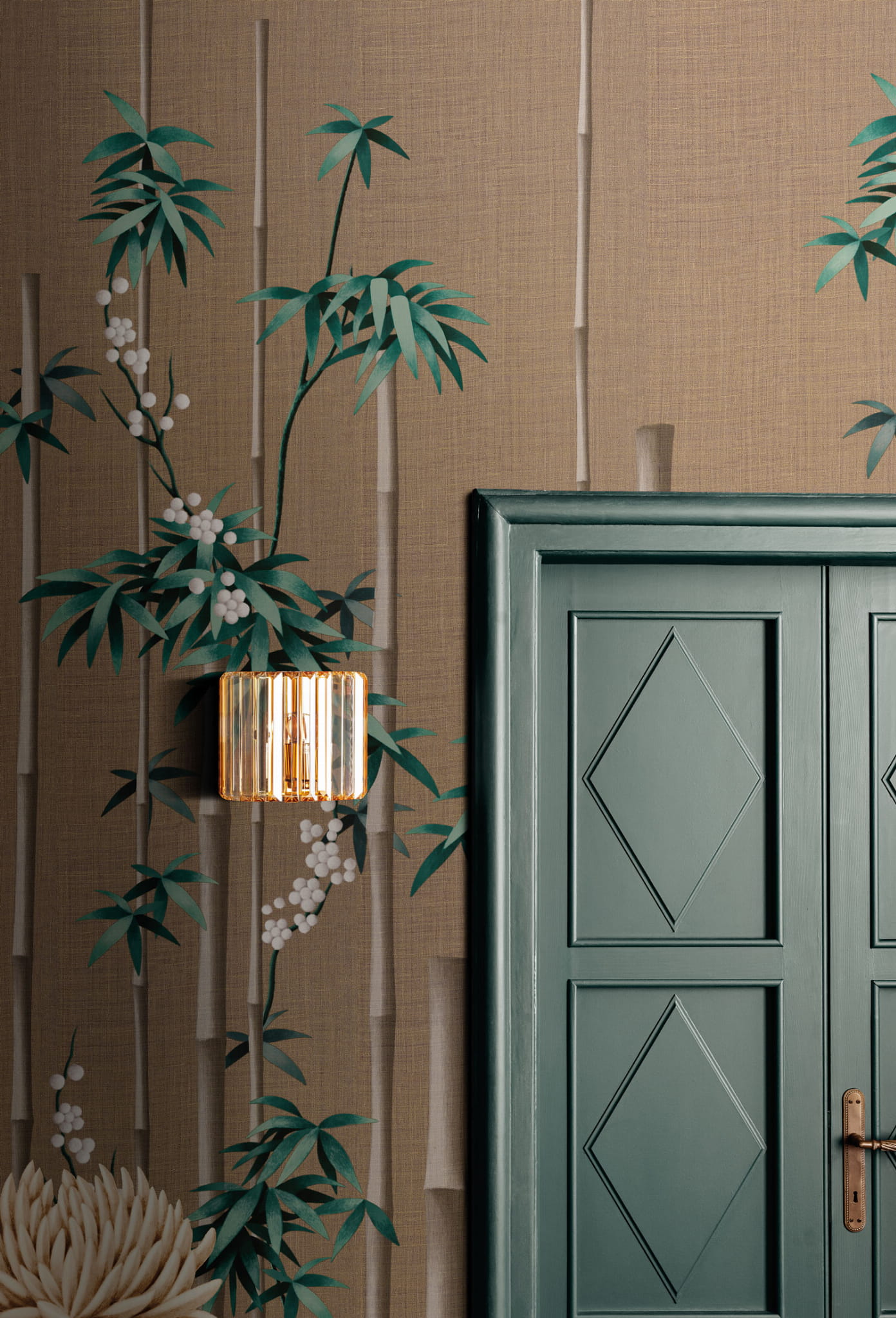 Mural London Art Kimono KMN10 B Fuki prezentuje las bambusowy z nieoczywistymi, kwitnącymi chryzantemami. W Japonii aranżacja kwiatów musi dawać poczucie równowagi i harmonii, zgodnie z otaczającym środowiskiem. Badane są kolory i kształty, tworzony jest taniec, który może wzbudzić doznania i uczucia. Na tym modelu bambus i chryzantema występują naprzemiennie, reprezentując nieśmiertelność, ponieważ rodząc się jesienią, stawiają czoła przeciwnościom zimna. Motyw doskonale sprawdzi się w stylu glamour oraz nowoczesnym. Mural London Art Kimono KMN10 B Fuki dostępny jest w pięciu wariantach kolorystycznych.