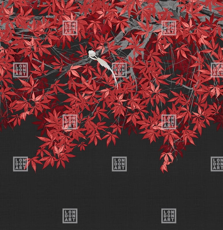 Mural London Art Kimono KMN20 C Tsukesage przedstawia gałęzie klonu japońskiego pnące się po ścianie. Pośród czerwonych liści można zauważyć rozmieszczone ptaki, które wzbogacają kompozycję. Klon japoński jest bardzo powszechnym symbolem w krainie wschodzącego słońca, stanowi symbol elegancji oraz wdzięku, nic dziwnego, że w wielu wierszach japońskich pisarzy, ale także w wielu obrazowych przedstawieniach, celebruje jego piękno. Model zapewni wnętrzu bogatą aranżację. Doskonale sprawdzi się w salonie oraz jadalni w stylu nowoczesnym. Mural London Art Kimono KMN20 C Tsukesage dostępny jest w pięciu wariantach kolorystycznych.