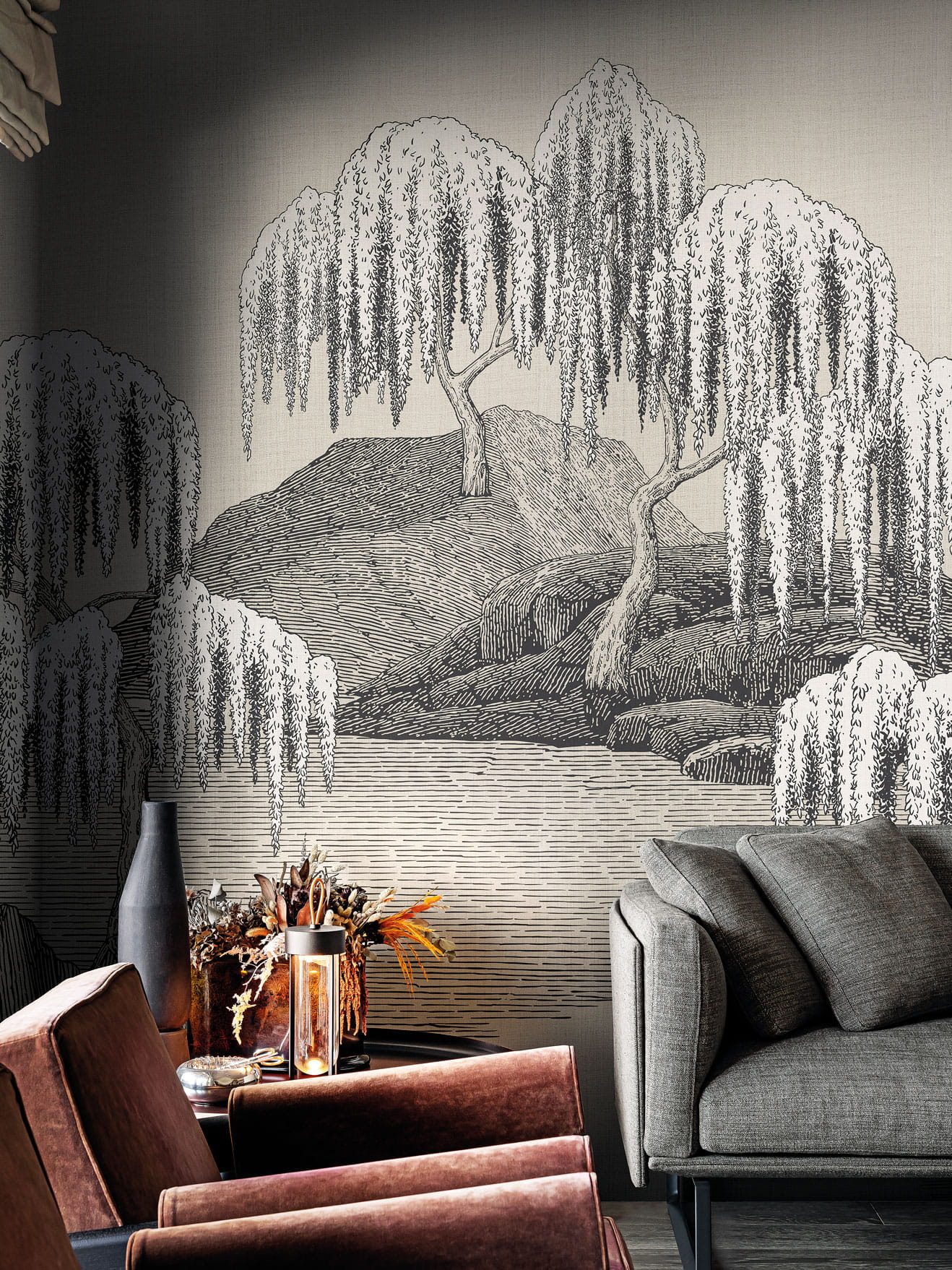 London Art MUN08 D Les Mille Et Une Nuits Saules Et Montagnes - mural japoński krajobraz z jeziorem
