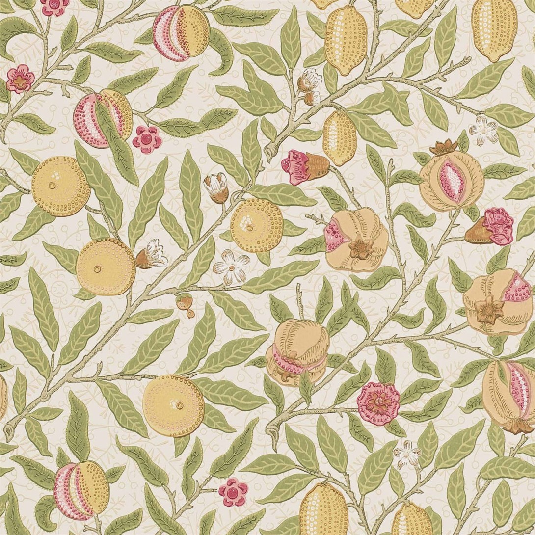 Tapeta Morris & Co Compilation 216840 Fruit Limestone/Artichoke przedstawia pnące gałęzie obładowane dojrzałymi granatami, cytrynami i kwitnącymi kwiatami. Ta odświeżona interpretacja pokazuje uwielbiany przez Morrisa projekt w nowym świetle. Precyzyjne wykończenie każdego detalu ukazuje jego doskonałość i jakość. Okleina umieszczona na ścianach kuchni i jadalni sprawi, że gotowanie i wspólny posiłek będzie przyjemniejszy. Tapeta Morris & Co Compilation 216840 Fruit Limestone/Artichoke dostępna jest w trzech wersjach kolorystycznych.