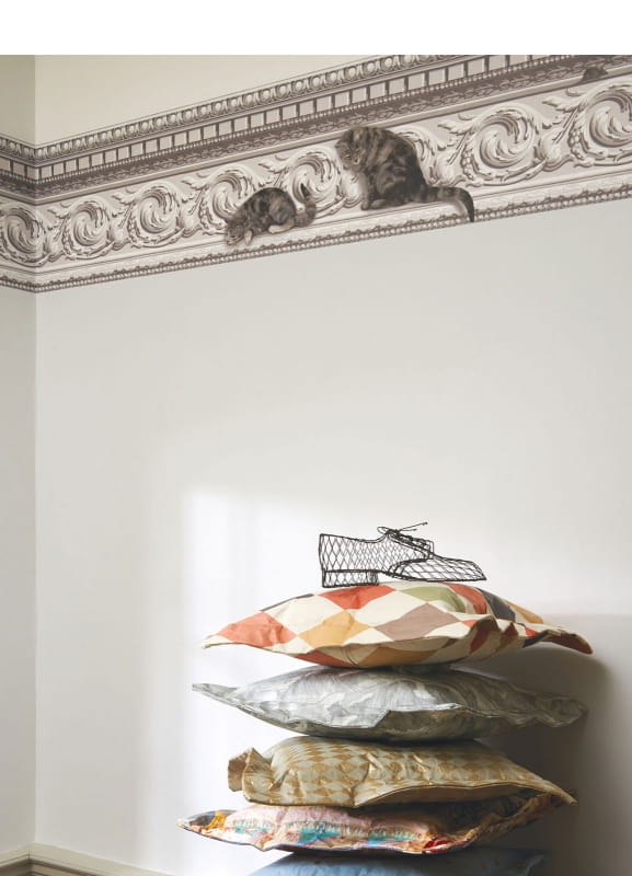 Dowcipna aranżacja klasycznej tapety z archiwum Cole & Son, Paddy & Louis przedstawiają dwa złośliwe koty oraz nieuchwytną mysz w stylu regencji. Tapeta dostępna w jednej kolorystyce kamienia i mory. Mierzy ona 34cm wysokości , a całe trio kotów i myszy powtarza się dwukrotnie w całej 7m rolce.