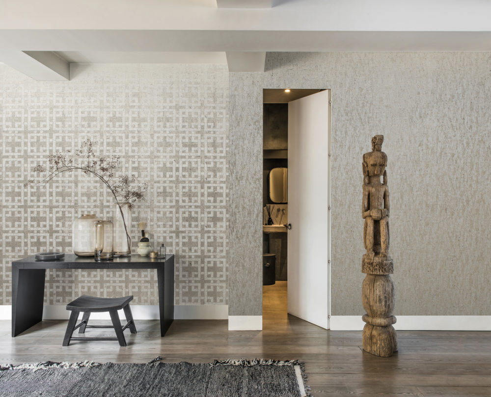 Tapeta Omexco Antarès ANT302 przedstawia geometryczny motyw złożony z rytmicznych, przenikających się linii, które tworzą wyrazistą, dekoracyjną siatkę o nowoczesnym charakterze. Organiczna struktura korkowego podłoża wprowadza do wnętrza szlachetną naturalność, a metaliczne drobinki dodają powierzchni subtelnego połysku świadczącego o rzemieślniczej precyzji wykonania. Geometryczny wzór obecny na tapecie akcentuje łagodny porządek kompozycji i wzmacnia odczucie eleganckiej dyscypliny, jednocześnie podkreślając artystyczny wymiar aranżacji. Właściwości korka harmonizują z filozofią producenta opartą na odpowiedzialnym podejściu do materiałów oraz zamiłowaniu do luksusowych, organicznych struktur. Wysoka jakość podłoża dopełnia wyrafinowany charakter kolekcji. Tapeta Omexco ANT302 Antarès sprawdzi się w projektach ceniących dopracowane proporcje oraz wysublimowaną dekoracyjność, podkreślając estetyczną dojrzałość wnętrza.