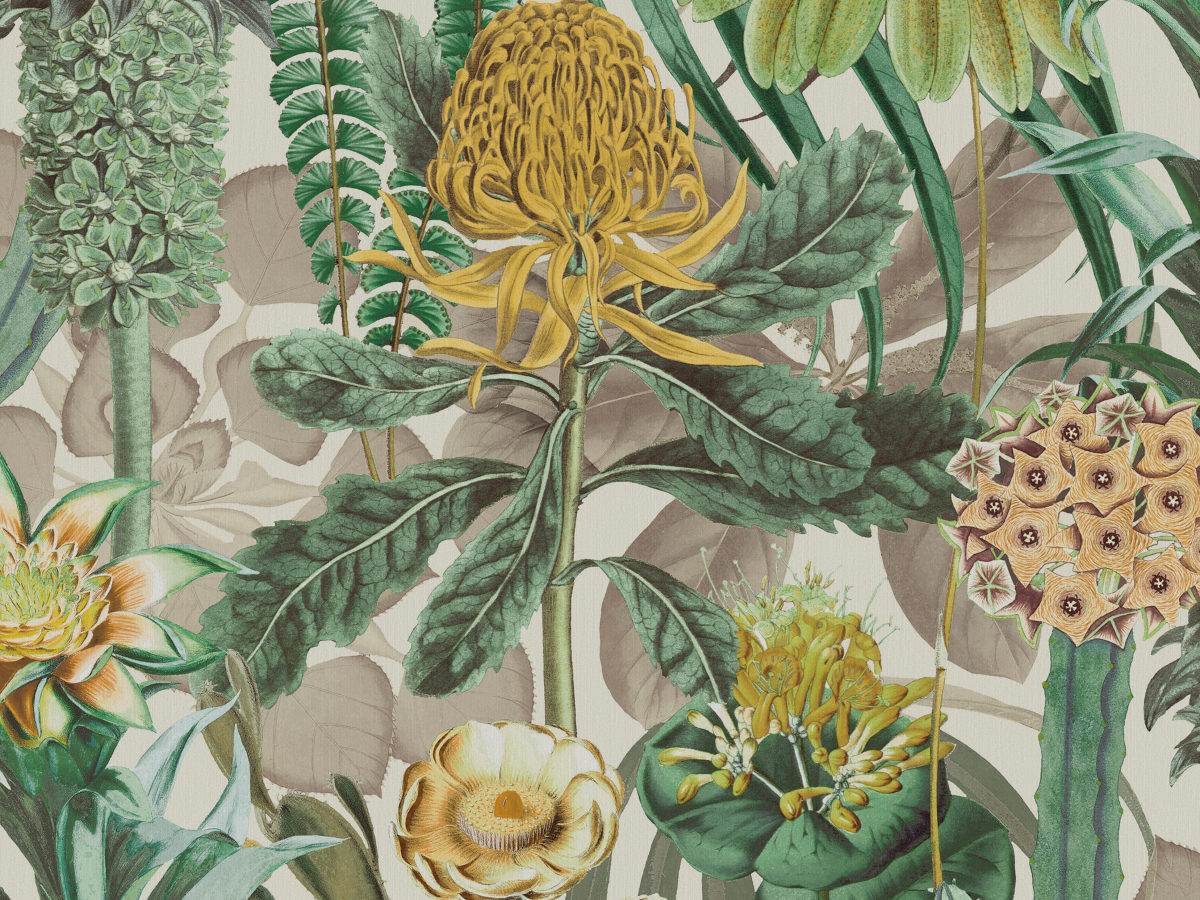 Tapeta Omexco Birds of Paradise BOP601 ukazuje gęsty układ egzotycznych roślin, w którym bujna botaniczna struktura tworzy powtarzalny, rytmiczny ornament o dekoracyjnym charakterze. Ilustracyjnie opracowane liście i kwiaty budują wielowarstwowy efekt, nadając ścianie głębię i wyrazistą teksturę wizualną. Podłoże oparte na mieszance celulozy i poliestru zapewnia oddychającą konstrukcję i stabilną powierzchnię, a zmywalność materiału ułatwia jego pielęgnację w codziennym użytkowaniu. Obecność włókien z recyklingu oraz druk realizowany przy użyciu energii słonecznej podkreślają dbałość o proces produkcyjny. Tapeta Omexco BOP601 Birds of Paradise wprowadza do wnętrza rozbudowany motyw botaniczny o wyraźnym, dekoracyjnym rytmie.
