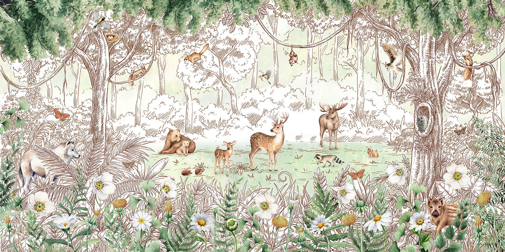 Mural Pastelowelove Forest Friends Spring przedstawia lekką, wiosenną opowieść zanurzoną w soczystych zieleniach i rozświetlonych bielach. Kompozycję tworzą leśne zwierzęta, niedźwiedzie, sarny, jelenie i dzik, uchwycone w naturalnych, swobodnych pozach w otoczeniu budzącej się do życia przyrody. Korony drzew tętnią energią - wiewiórki skaczą między gałęziami, a młode liście i pąki kwiatów dodają ilustracji świeżości. Wzór oddaje rytm lasu w czasie wiosennego przebudzenia, wprowadzając do wnętrza harmonię i optymizm. Dekoracja została wykonana przy użyciu ekologicznego druku UV-gel, dzięki czemu zachowuje głębię kolorów przy jednoczesnym zachowaniu najwyższych standardów bezpieczeństwa. Winylowe podłoże na flizelinie o gramaturze 290 g zapewnia trwałość oraz odporność na uszkodzenia i światło. Mural Pastelowelove Forest Friends Spring wyróżnia się ziarnistą strukturą i eleganckim wykończeniem. Posiada certyfikaty FSC, A+ i Greenguard. Doskonale sprawdza się w aranżacjach, które łączą naturę z dziecięcą wrażliwością.