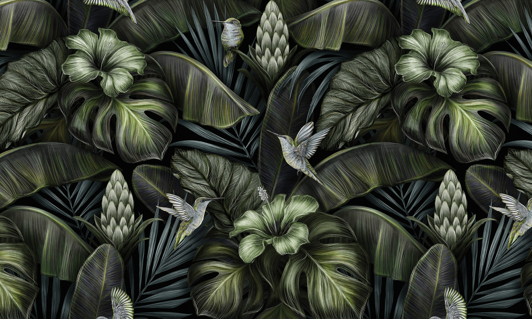 Mural Rauv The First Botanical Bliss przedstawia bujne egzotyczne liście i subtelnie wplecione sylwetki kolibrów, które nadają kompozycji lekkości i energii. Ciemne tło potęguje wrażenie głębi, dzięki czemu zieleń staje się bardziej intensywna i wyrazista, a całość przyciąga uwagę niczym dzieło sztuki. Ten wzór idealnie pasuje do wnętrz w stylu urban jungle, nowoczesnym lub eklektycznym, w których natura staje się centralnym motywem aranżacji. Zastosowanie podkładu Mesh podkreśla fakturalność i wzmacnia kontrast między światłem a cieniem, co pozwala muralowi oddziaływać jak trójwymiarowy pejzaż. Mural Rauv The First Botanical Bliss to wybór dla osób, które pragną połączyć elegancję designu z naturalnym dynamizmem, zamieniając ścianę w pełną życia scenę tropikalnego ogrodu.