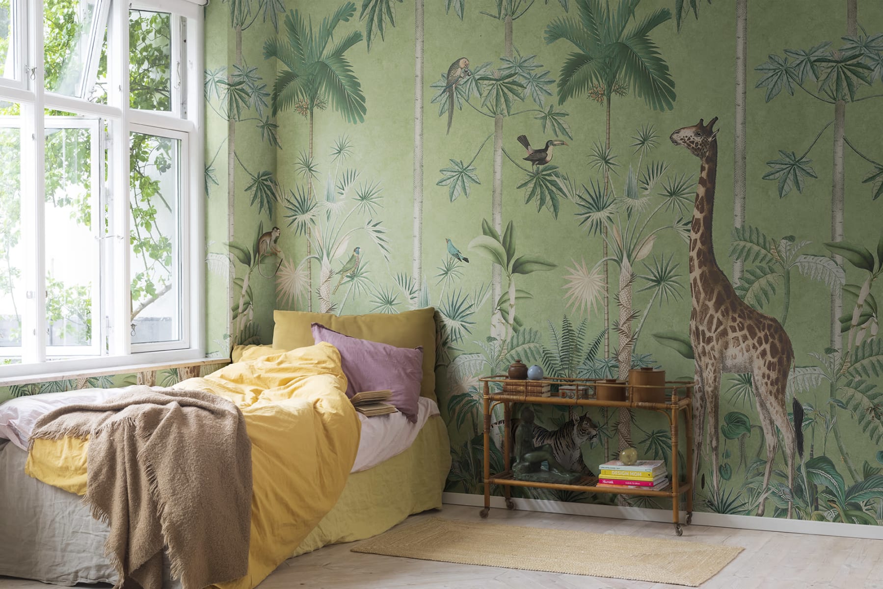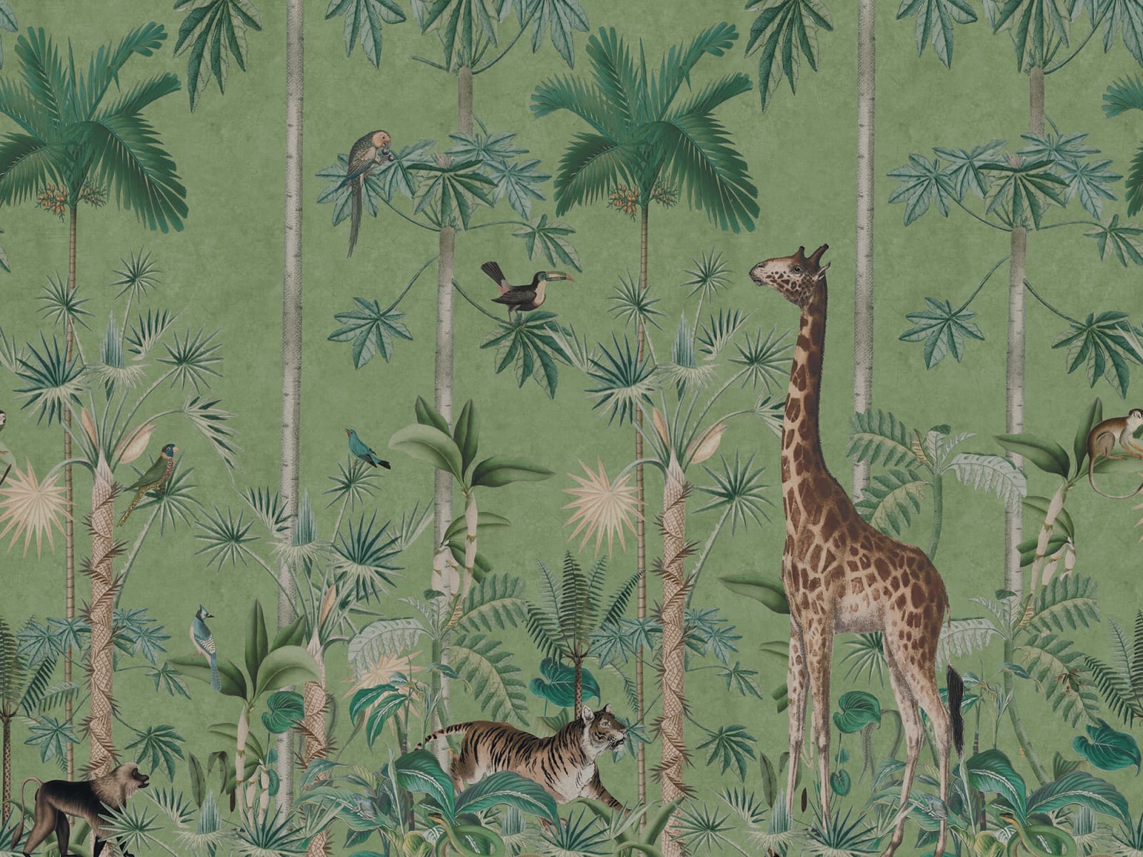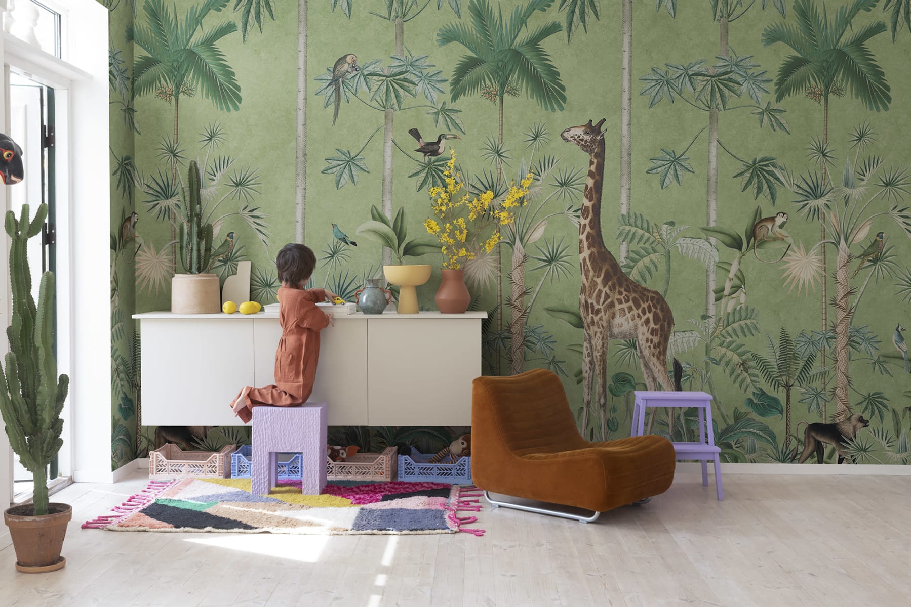 Mural Rebel Walls R16793 Rebel Favorites Giraffe's Stroll Emerald prezentuje tropikalny wzór, który natychmiast przyciąga uwagę swoimi detalami i różnorodnością fauny i flory. Urocza żyrafa, dziki tygrys i ptaki skrywające się w gęstwinie egzotycznych roślin tworzą harmonijną, pełną życia kompozycję. Mural doskonale oddaje klimat dzikiej natury, wprowadzając do wnętrz odrobinę przygody i egzotyki. Dekoracja pasuje zarówno do różnego rodzaju lokali usługowych, jak i pokoi dziecięcych. Najlepiej zestawić ją z drewnianymi meblami o prostych formach, które nie będą konkurować z bogactwem wzoru. Świetnie komponuje się z roślinami doniczkowymi i dodatkami z lnu i bawełny. W dziecięcych pokojach warto połączyć ją z pastelowymi akcentami, które dodadzą pomieszczeniu lekkości i podkreślą przyjazny, a zarazem edukacyjny charakter przestrzeni. Mural Rebel Walls R16793 Rebel Favorites Giraffe's Stroll Emerald sprawi, że każde pomieszczenie nabierze niepowtarzalnego, egzotycznego uroku.