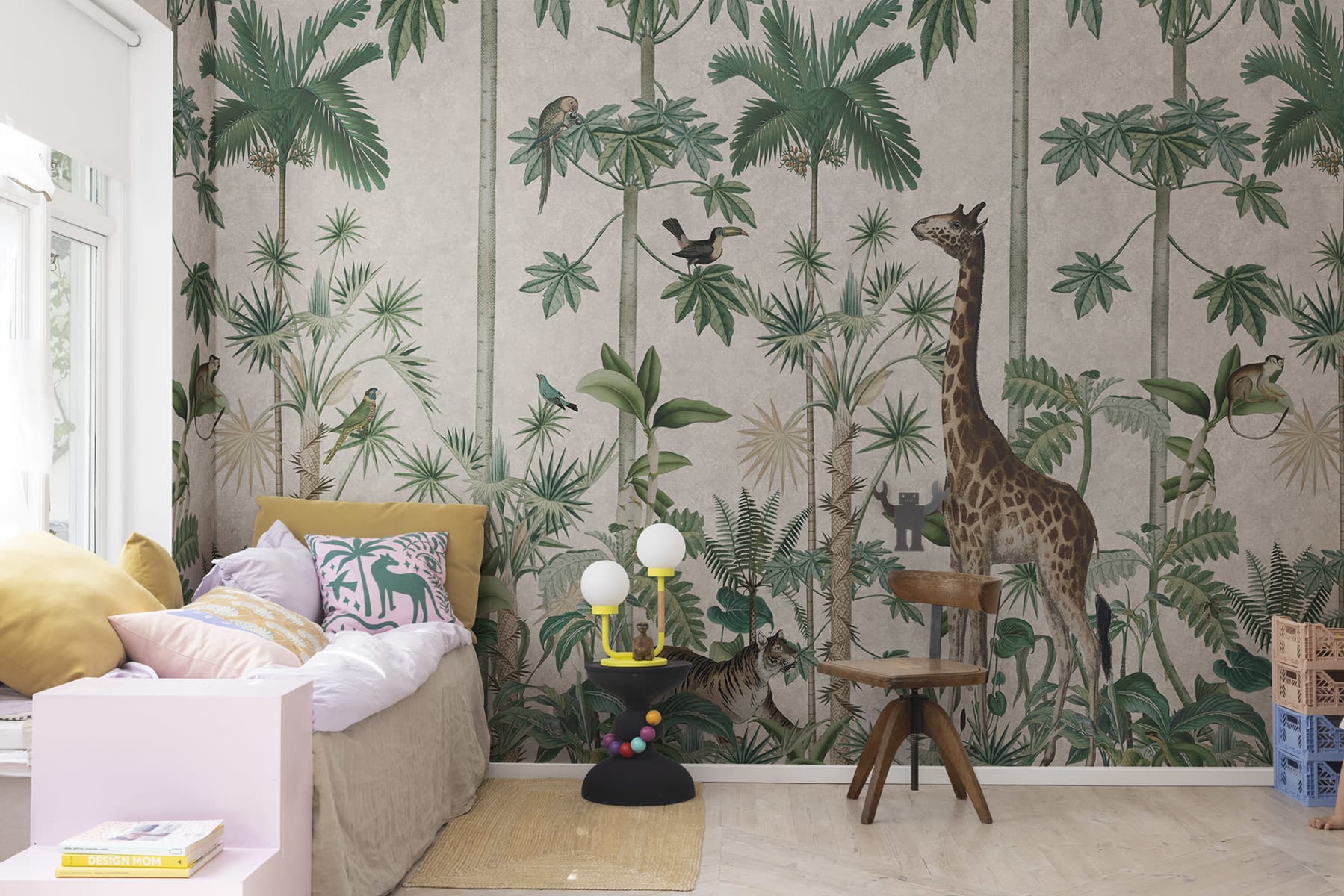 Mural Rebel Walls R16795 Rebel Favorites Giraffe's Stroll Pastel Pink prezentuje tropikalny wzór, który natychmiast przyciąga uwagę swoimi detalami i różnorodnością fauny i flory. Urocza żyrafa, dziki tygrys i ptaki skrywające się w gęstwinie egzotycznych roślin tworzą harmonijną, pełną życia kompozycję. Mural doskonale oddaje klimat dzikiej natury, wprowadzając do wnętrz odrobinę przygody i egzotyki. Dekoracja pasuje zarówno do różnego rodzaju lokali usługowych, jak i pokoi dziecięcych. Najlepiej zestawić ją z drewnianymi meblami o prostych formach, które nie będą konkurować z bogactwem wzoru. Świetnie komponuje się z roślinami doniczkowymi i dodatkami z lnu i bawełny. W dziecięcych pokojach warto połączyć ją z pastelowymi akcentami, które dodadzą pomieszczeniu lekkości i podkreślą przyjazny, a zarazem edukacyjny charakter przestrzeni. Mural Rebel Walls R16795 Rebel Favorites Giraffe's Stroll Pastel Pink sprawi, że każde pomieszczenie nabierze niepowtarzalnego, egzotycznego uroku.