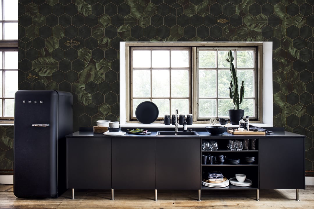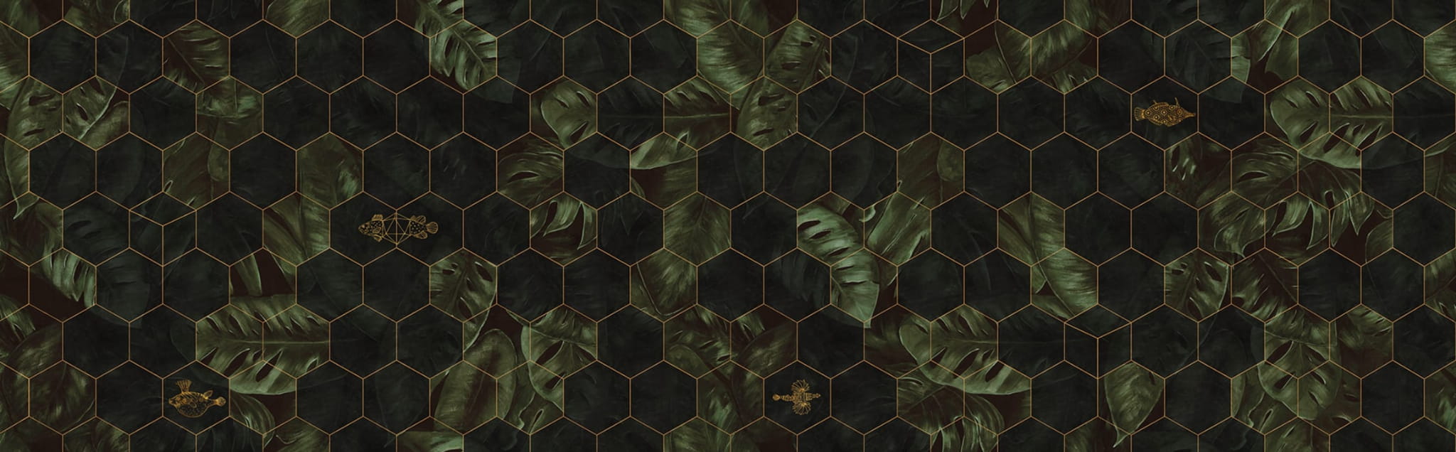 Mural Rebel Walls R17181 Well-Being Hexagon Leaves to wspaniała dekoracja o naturalnym designie. Projekt przedstawia sześciokątne płytki z pięknymi liśćmi monstery w dwóch odcieniach zieleni. Graficzne detale złotych ryb dodają wodnego akcentu, aby wzbogacić całą kompozycję o nieoczekiwany akcent. Mural Rebel Walls R17181 Well-Being Hexagon Leaves perfekcyjnie sprawdzi się jako wykończenie wnętrz w stylu nowoczesnym, klasycznym, art-deco, minimalistycznym czy vintage. Będzie ciekawą ozdobą, zdobiącą akcentową ścianie salonu, przedpokoju, łazienki, jadalni, przedpokoju czy sypialni.