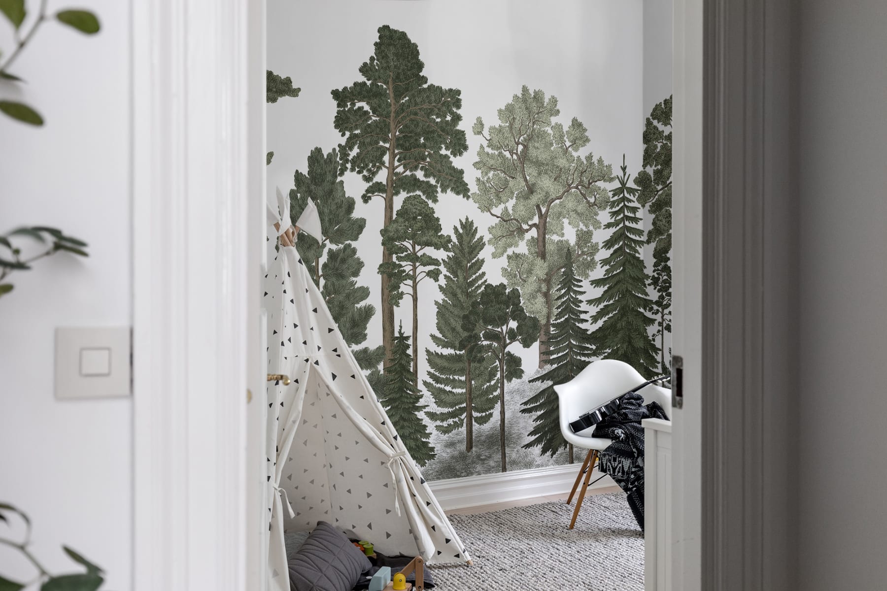 Mural Rebel Walls Rebel Favorites Scandinavian Bellewood R17204 to minimalistyczna dekoracja, która wniesie do wnętrza naturalny i spokojny charakter. Wzór wysokich drzew przyciąga uwagę swoją prostotą i elegancją. Dzięki niemu pomieszczenie nabierze harmonii i przestronności. To doskonały wybór do przestrzeni, w których się relaksujesz - np. do salonu, sypialni czy jadalni. Mural Rebel Walls R17204 Rebel Favorites Scandinavian Bellewood pasuje do wnętrz utrzymanych w stylu skandynawskim, w których dominują naturalne materiały, takie jak drewno, wełna czy bawełna. Idealnie komponuje się z meblami o prostych liniach i neutralnych kolorach. Wprowadzenie tej dekoracji do przestrzeni to sposób na stworzenie spokojnej atmosfery, która sprzyja relaksowi i odpoczynkowi. Wzór drzew doda wnętrzu naturalnego uroku, jednocześnie nie dominując nad resztą wystroju.