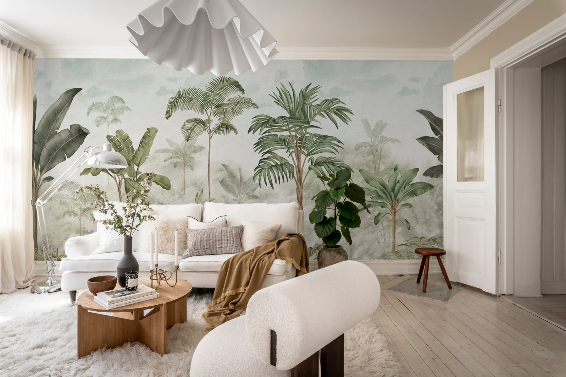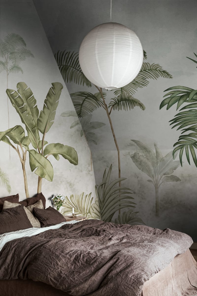 Mural Rebel Walls Scenic Landscapes Jungle Horizon Green R18805 codziennie przenosić Cię będzie w głąb gęstej, skąpanej we mgle dżungli, w której majestatyczne palmy zachwycają swoją urodą. Dekoracja ma lekko mistyczny, tajemniczy charakter, który wniesie do wnętrz niepowtarzalny klimat. Jej kompozycja jest bardzo zrównoważona, nie przytłoczy przestrzeni, ale jednocześnie zwróci na siebie uwagę. Mural Rebel Walls R18805 Scenic Landscapes Jungle Horizon Green świetnie komponuje się z wnętrzami urządzonymi w stylu boho, vintage czy urban jungle. Dostępny jest w 3 różnych wersjach kolorystycznych, dzięki czemu bez problemu zintegrujesz go z własnymi meblami i dodatkami.