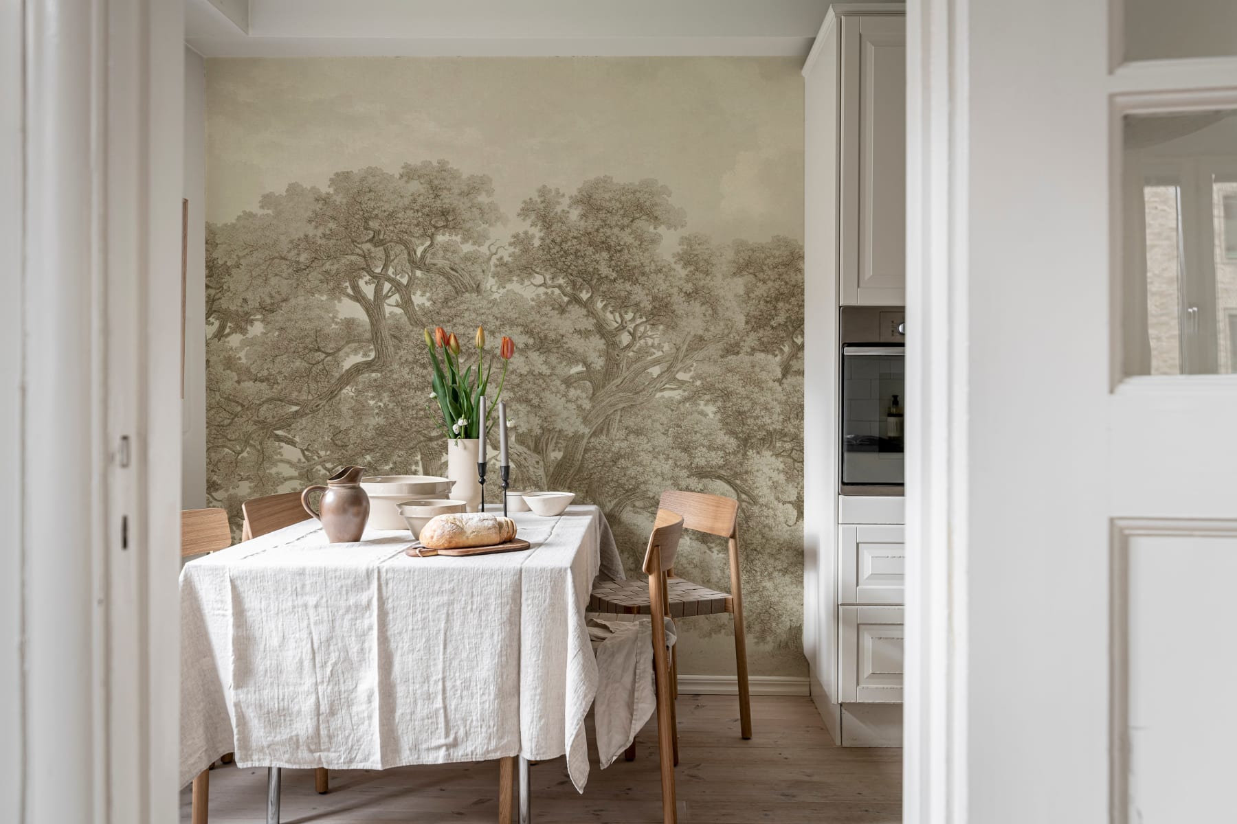 Mural Rebel Walls Scenic Landscapes Vintage Oaks Beige R18821 przedstawia majestatyczne dęby, które częściowo namalowano ręcznie. Dekoracja doda przestrzeniom wytwornego i eleganckiego charakteru. Dostępność 3 różnych wersji kolorystycznych sprawia, że bez problemu dopasujesz ją do własnych mebli i dodatków. Motyw drzew jest na tyle uniwersalny, że sprawdzi się w bardzo różnie urządzonych wnętrzach - nowoczesnych, skandynawskich, rustykalnych, eklektycznych czy klasycznych. Rebel Walls R18821 Scenic Landscapes Vintage Oaks Beige to idealny wybór dla tych, którzy pragną wnieść do swojego domu pierwiastek przyrody. Mural ten doskonale sprawdzi się w salonie, jadalni czy sypialni, tworząc przestrzeń do relaksu i kontemplacji wśród piękna i spokoju, jaki oferuje ten motyw.