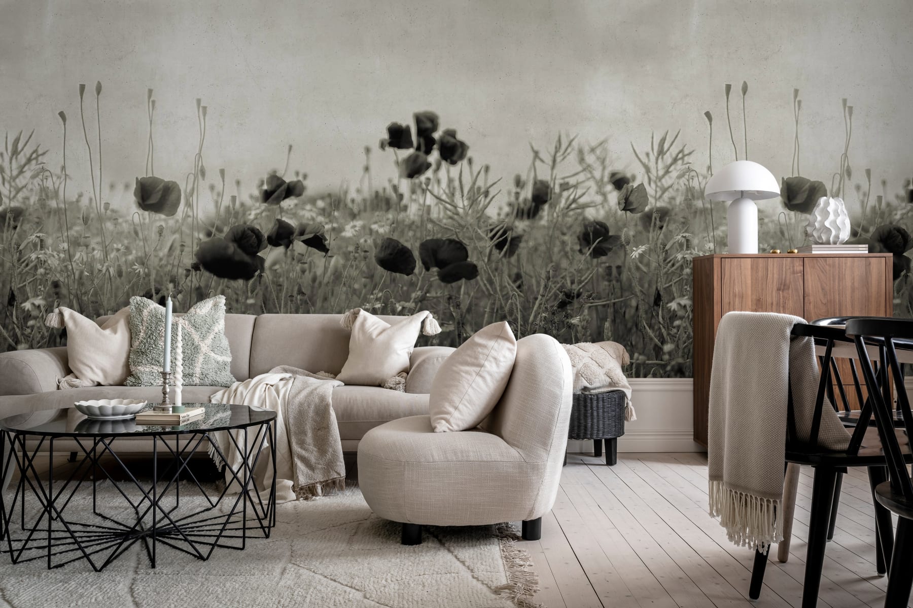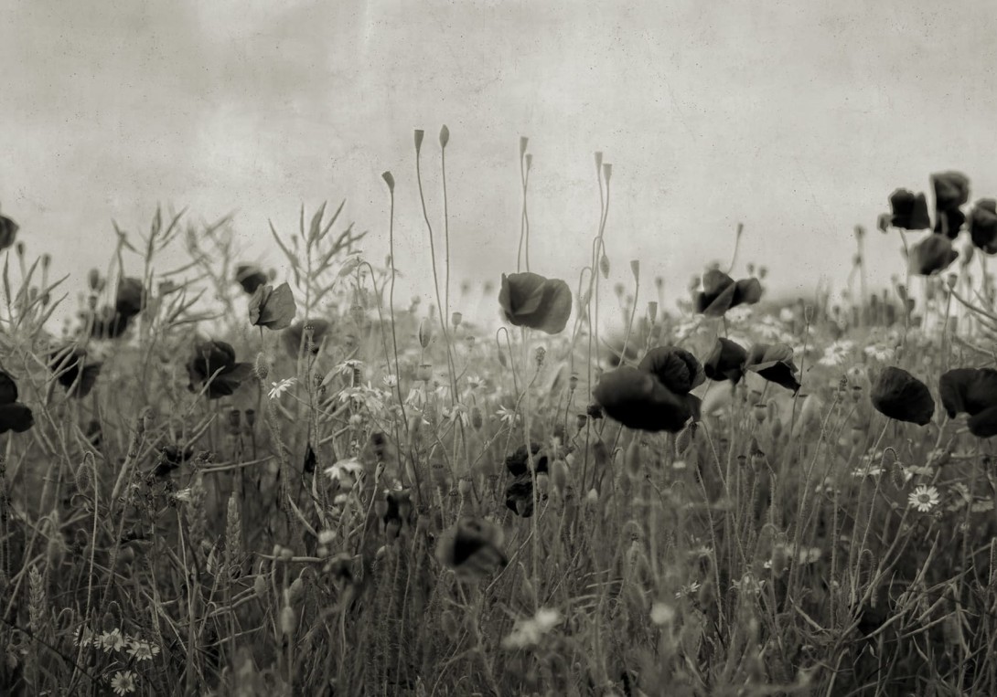 Rebel Walls R18871 Mystic Shades Poppy Field Black & White - mural w maki na łące