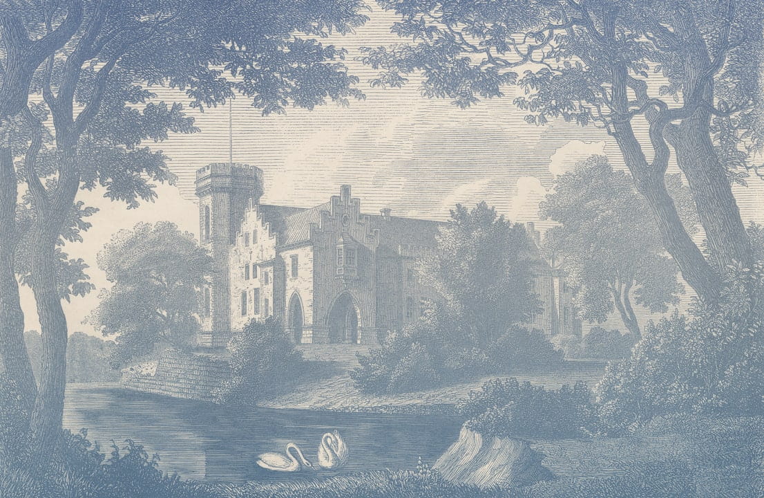 Mural Rebel Walls Vintage Brocade R19225 Swan Pond Blue wysuwa na pierwszy plan parę łabędzi pływającą po jeziorze. W tle wznosi się szkicowany zamek, który otoczony jest dookoła parkiem pałacowym. Każdy szczegół jest umiejętnie wkomponowany w całość scenerii. Wzór nadaje pomieszczeniu zaskakujący efekt, po którym następuje uczucie ciepłego uścisku. Model doskonale sprawdzi się w salonie, gabinecie oraz jadalni. Mural Rebel Walls Vintage Brocade R19225 Swan Pond Blue dostępny jest w trzech wariantach kolorystycznych.