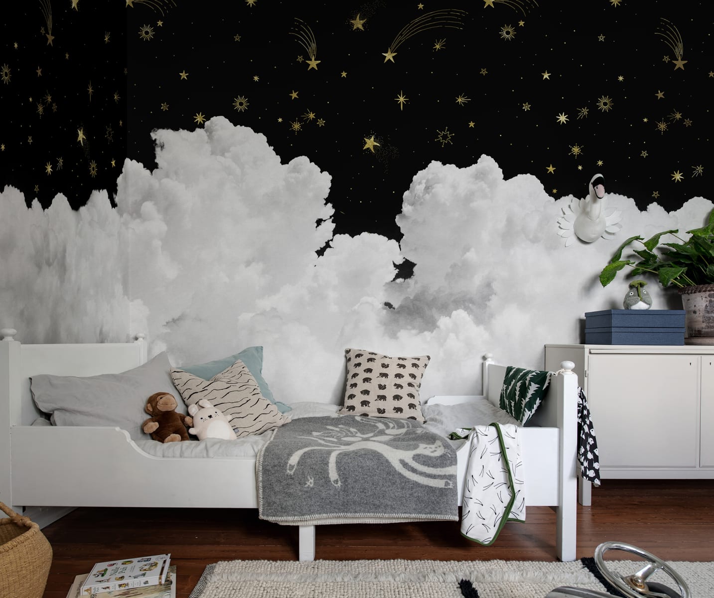 Mural Rebel Walls Pops Star Cloud Nigh R19351 to dekoracja, która wprowadzi do wnętrza poczucie lekkości i spokoju. Motyw chmur i gwieździstego nieba pozytywnie wpływa na optykę pomieszczenia, ponieważ dodaje ścianie głębi. Dzięki obłokom wnętrze nabierze również odprężającego charakteru. Mural Rebel Walls Pops Star Cloud Nigh R19351 doskonale sprawdzi się w nowoczesnych i minimalistycznych aranżacjach, nie dominując nad innymi elementami wystroju. Jego eteryczny motyw sprawia, że jest uniwersalnym dodatkiem do sypialni, salonu lub pokoju dziecięcego. Chmury to ponadczasowy akcent dekoracyjny, który wprowadza równowagę i przytulność do wnętrz. To rozwiązanie idealne dla osób poszukujących prostych, a zarazem efektownych dekoracji, które odświeżają wygląd pomieszczenia, dodając mu subtelnego charakteru.