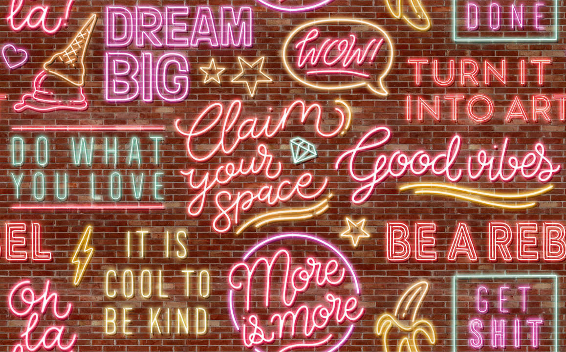 Mural Rebel Walls More is More R19473 Neon Vibes Brickwall to odważny projekt z neonową topografią, która na pewno przyciągnie spojrzenia zaproszonych gości. Model przedstawia optymistyczne cytaty w niesamowitej formie. Dzięki umieszczeniu okleiny na ścianie można stworzyć swój własny klimat lat 50. we wnętrzu. Dekoracja doskonale sprawdzi się w salonie jako tło dla kanapy lub stołu karcianego. Mural Rebel Walls More is More R19473 Neon Vibes Brickwall dostępny jest w pięciu wariantach kolorystycznych.
