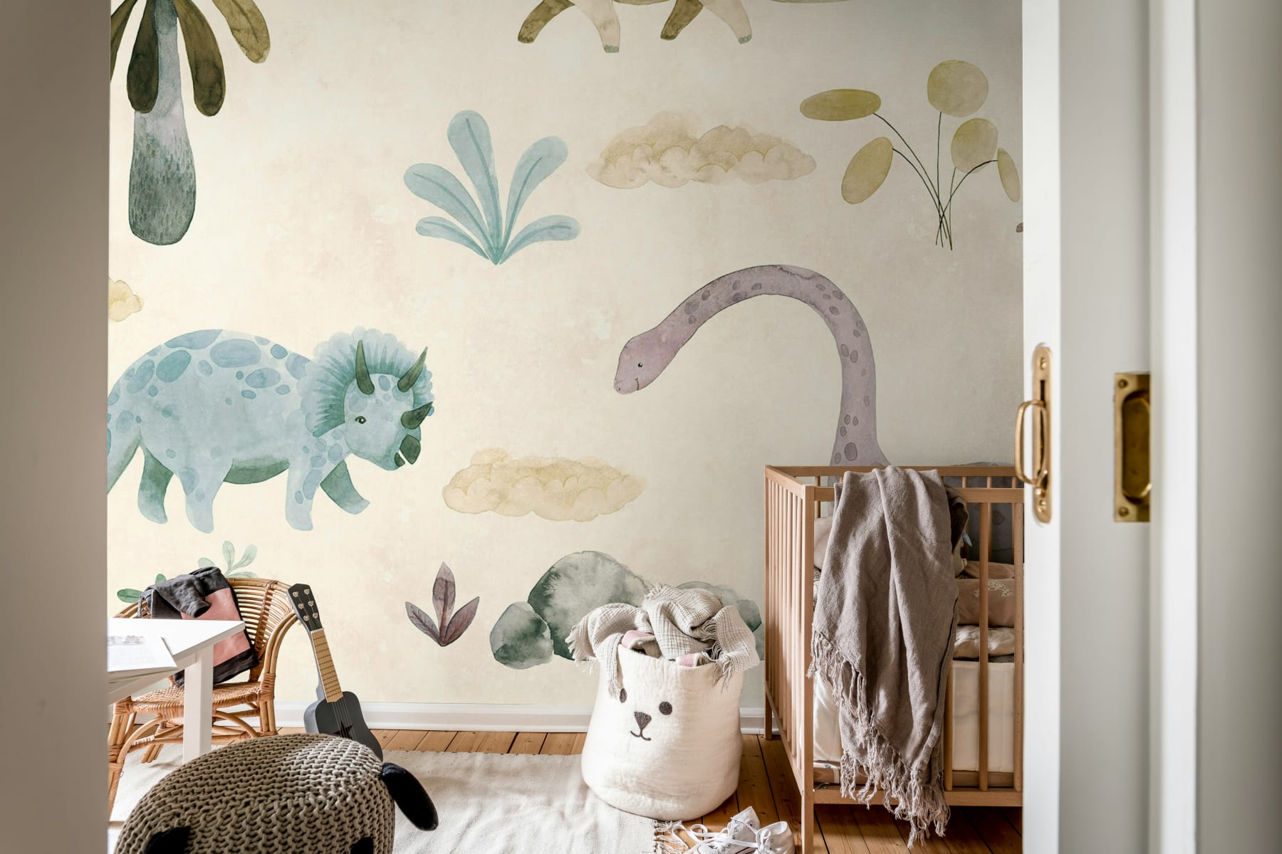 Mural Rebel Walls R19958 Family Fun Dinosaur Oasis Pastel wniesie do dziecięcych wnętrz niepowtarzalny, radosny klimat. Prezentuje różnorodne dinozaury i rośliny. Kompozycja muralu jest oryginalna, ale i ponadczasowa i nieprzytłaczająca - stworzy atmosferę pełną radości i ciepła. Dekorację warto połączyć z prostymi, drewnianymi meblami, miękkimi kocami, wełnianymi dywanami oraz kolorowymi dodatkami w postaci nocnych lampek czy zabawek. Mural Rebel Walls R19958 Family Fun Dinosaur Oasis Pastel to rozwiązanie, które doskonale wpisuje się w pokoje dziecięce, sale zabaw oraz przedszkola - każdemu z tych miejsc doda bajkowego klimatu.