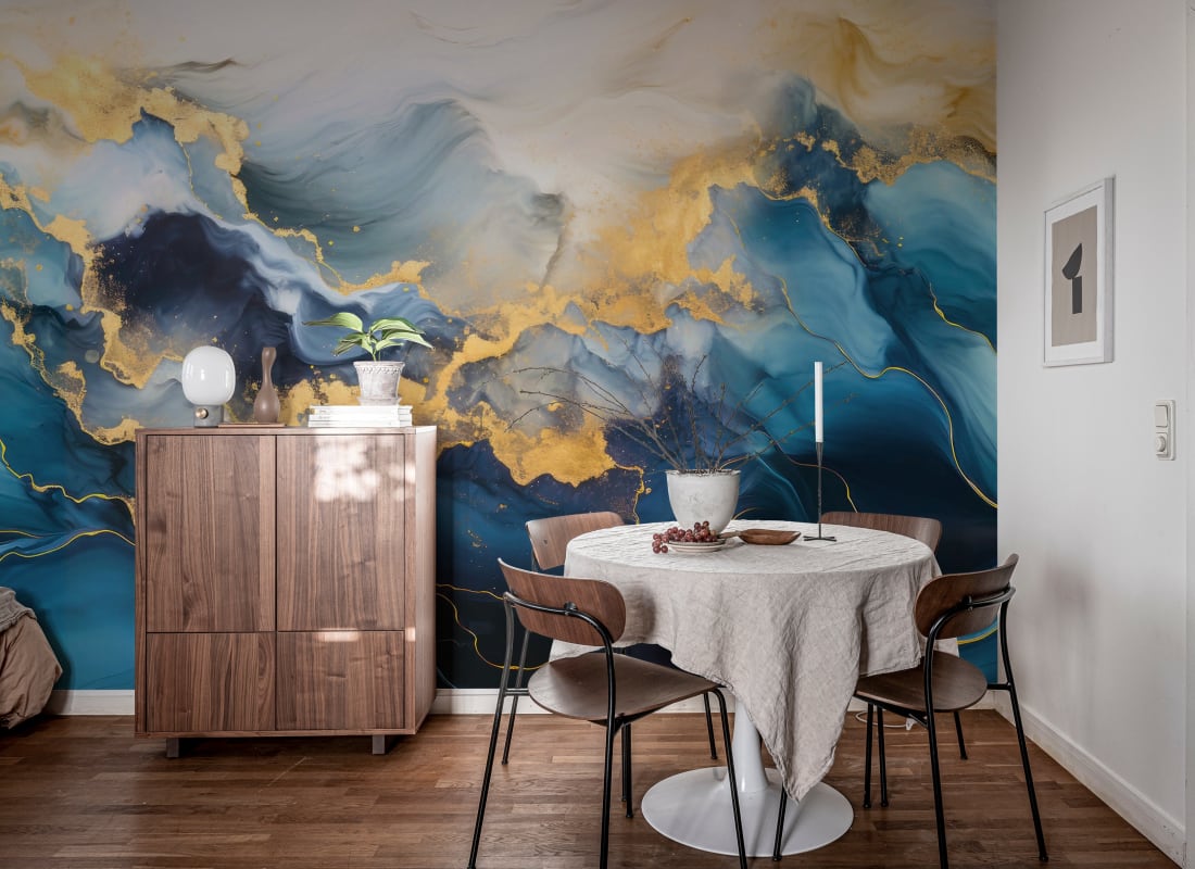 Mural Rebel Walls Pops Gold Stream Blue R20234 prezentuje dynamiczny wzór inspirowany strukturą naturalnego marmuru, wzbogacony o abstrakcyjne przejścia tonalne i dekoracyjne złocenia. Dekoracja łączy w sobie intensywność głębokich błękitów z jasnymi, rozproszonymi akcentami oraz kontrastującymi, nieregularnymi liniami przypominającymi spękania i żyłki kamienia. Ten model doskonale odnajduje się w przestrzeniach wymagających wizualnego wyróżnienia – od eleganckich salonów, po nowoczesne strefy dzienne. Mural Rebel Walls R20234 Pops Gold Stream Blue wyróżnia się wyrafinowaną formą graficzną, która imituje teksturę kamiennego bloku, oferując przy tym efekt dekoracyjny znacznie bardziej wyrazisty niż klasyczne imitacje materiałów naturalnych. Idealnie wpisuje się w aranżacje z elementami metalu, szkła i drewna, tworząc spójną i wysmakowaną całość.