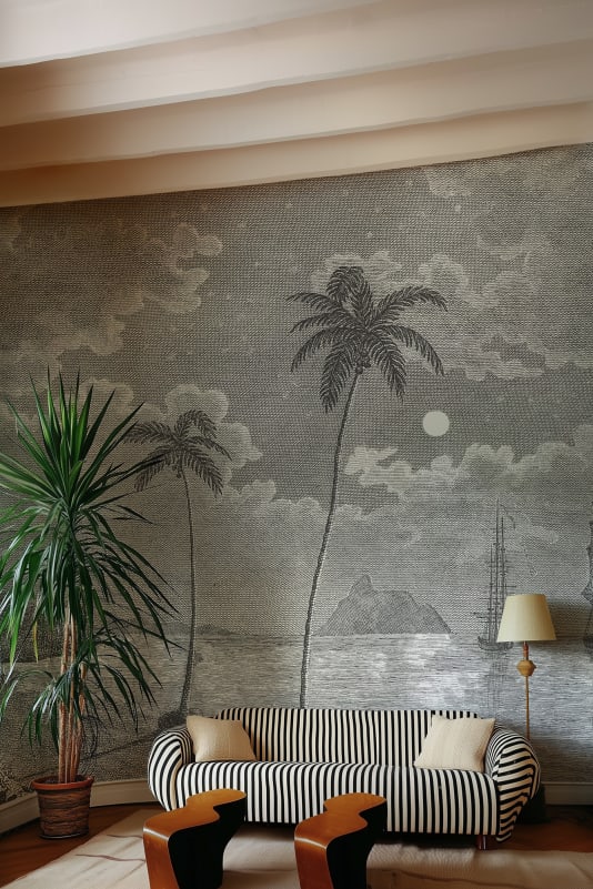 Mural Rebel Walls Eden Escape Palm Beach Black & White R20897 oddaje ducha dawnych podróży i egzotycznych krajobrazów w eleganckiej, monochromatycznej odsłonie. Motyw smukłych palm, spokojnego morza i żaglowców na horyzoncie tworzy kompozycję pełną równowagi i spokoju. Rysunek w stylu vintage nawiązuje do dawnych rycin podróżniczych, a jego precyzyjna kreska dodaje wnętrzu artystycznego wyrazu. To mural, który wprowadza do przestrzeni lekkość i harmonię, jednocześnie zachowując wyrafinowany, ponadczasowy charakter. Świetnie sprawdza się w aranżacjach modern classic, gdzie podkreśla elegancję detali, oraz w stylu boho, w którym staje się tłem dla naturalnych materiałów i ciepłych barw. W zestawieniu z jasnym drewnem, lnianymi tkaninami i minimalistycznymi dodatkami tworzy wnętrze pełne spokoju i subtelnej egzotyki. Mural Rebel Walls R20897 Eden Escape Palm Beach Black & White dodaje pomieszczeniu głębi, klasy i podróżniczego ducha.