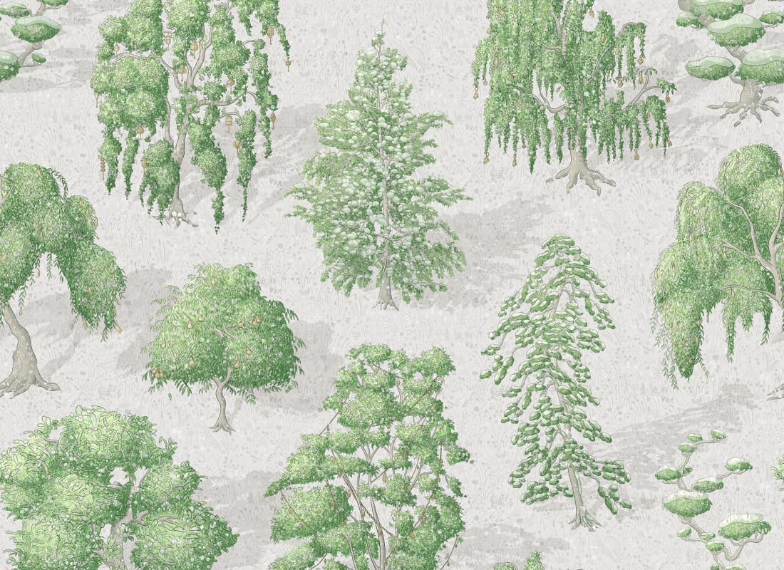 Mural Rebel Walls Sam Wilde Yggdrasil Forest Light Green R21044 to dekoracja inspirowana ilustracją przyrodniczą, w której ręcznie szkicowane drzewa emanują lekkością dzięki subtelnej palecie zieleni. Kompozycja oparta jest na czytelnym rytmie powtarzalnych form, co pozwala zachować przejrzystość nawet przy dużej skali wzoru. Tło w delikatnym odcieniu pastelowej szarości kontrastuje z jasną zielenią drzew, tworząc miękki, niemal eteryczny efekt. Rysunek zachowuje równowagę między graficzną strukturą a ilustracyjną swobodą, dzięki czemu produkt świetnie wpisuje się w jasne, przestronne aranżacje. Dekoracja wprowadzi świeżość i poczucie optycznej lekkości, rozjaśni wnętrze i nada mu organicznego rytmu. Mural Rebel Walls R21044 Sam Wilde Yggdrasil Forest Light Green pasuje do salonu, jadalni, przedpokoju, gabinetu czy pokoju dziecięcego, w których dominuje naturalna prostota i łagodna kolorystyka.