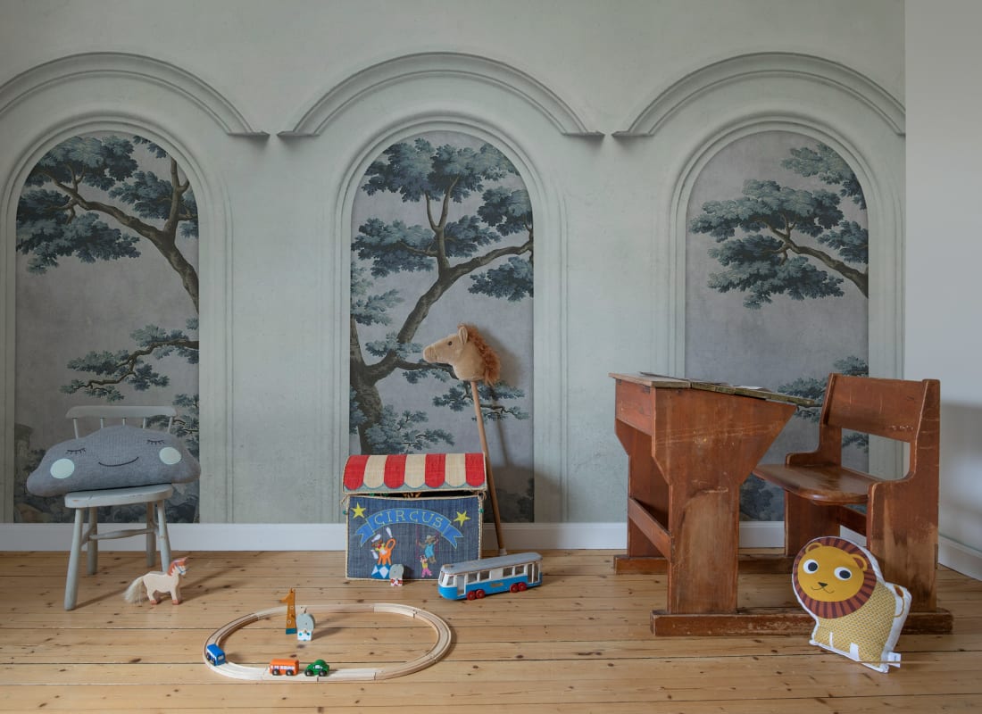 Mural Rebel Walls Pops Woodland Arches Blue R21361 ukazuje malowniczy pejzaż zamknięty w symetrycznych łukach inspirowanych klasyczną architekturą. W tle pojawiają się rozłożyste korony drzew, których sylwetki zyskują miękkość dzięki chłodnym odcieniom niebieskości i przygaszonej szarości. Dekoracja balansuje na granicy malarstwa pejzażowego i iluzji architektonicznej, tworząc efekt otwartego widoku na spokojny ogród. To rozwiązanie doskonale wpisuje się w przestrzenie, które wymagają zarówno głębi, jak i kojącej atmosfery. Mural Rebel Walls R21361 Pops Woodland Arches Blue łączy kunszt klasycznej kompozycji z kontemplacyjnym charakterem natury, wprowadzając do wnętrza subtelny rytm, idealny dla aranżacji z nutą elegancji.