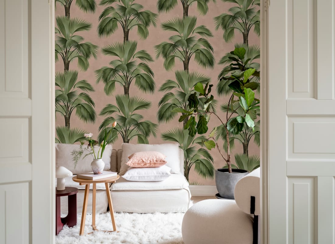 Mural Rebel Walls Eden Escape Tropical Rhythm Pink R21441 prezentuje harmonijny motyw smukłych palm, który dodaje wnętrzu lekkości i subtelnej elegancji. Rysunkowa kompozycja roślin tworzy spokojny rytm, wprowadzający do przestrzeni wrażenie porządku i naturalnej równowagi. Detale liści podkreślają artystyczny wymiar wzoru, a jego proporcje sprawiają, że ściana staje się tłem o wyjątkowej głębi. Mural idealnie uzupełnia aranżacje w stylu modern organic, w których łączy się naturalne materiały z miękkimi formami, oraz w stylu eklektycznym, gdzie stanowi spoiwo między klasyką a współczesnością. W towarzystwie drewna, rattanu i lnu buduje przyjazny, harmonijny klimat. Mural Rebel Walls R21441 Eden Escape Tropical Rhythm Pink dodaje przestrzeni spokoju i elegancji, tworzy wnętrze o wyważonym, tropikalnym rytmie.