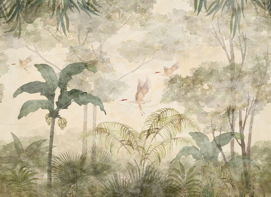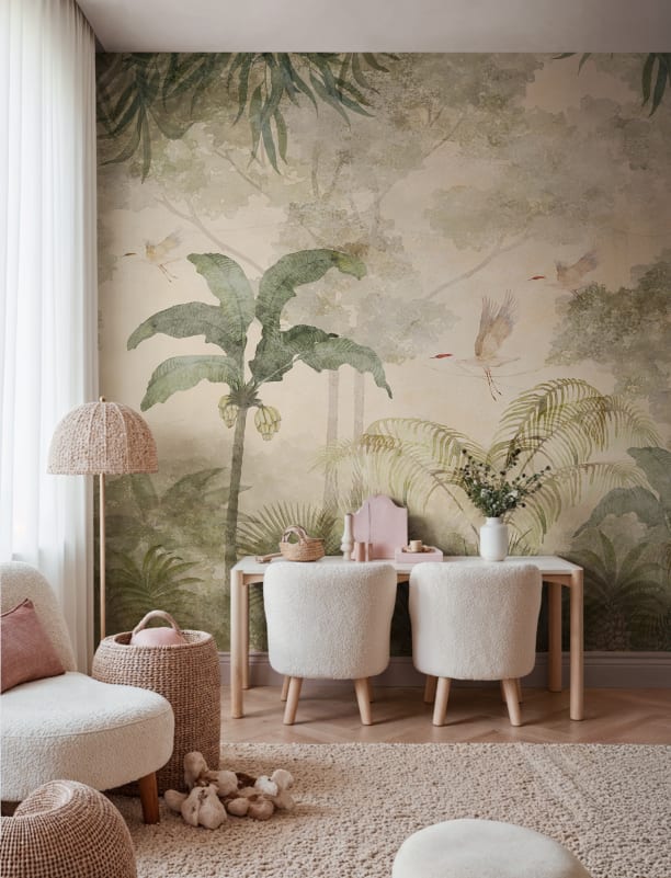 Mural Rebel Walls Eden Escape Exotic Eden Day R21462 ukazuje tętniący życiem tropikalny krajobraz, w którym bujna roślinność i ptaki tworzą pełną harmonii, malarską scenę. Delikatne akwarelowe przejścia i miękkie kontury nadają kompozycji wrażenia głębi, przywołując spokój i świeżość egzotycznej natury. To wzór, który przynosi do wnętrza ukojenie i naturalne piękno, sprawiając, że przestrzeń staje się bardziej otwarta i pełna światła. Mural wyróżnia się wyważonym rytmem form, dzięki czemu doskonale pasuje zarówno do aranżacji boho, jak i urban jungle, a także do wnętrz w duchu modern organic. W połączeniu z rattanem, drewnem i tkaninami o naturalnej fakturze tworzy przestrzeń, w której można odpocząć i nabrać energii. Mural Rebel Walls R21462 Eden Escape Exotic Eden Day dodaje wnętrzu spokoju, ciepła i organicznej elegancji, która łączy przyrodę z wyrafinowanym designem.