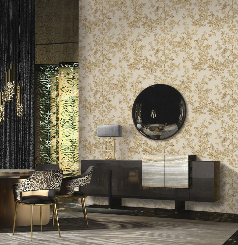 Zbiór tapet winylowych Roberto Cavalli No.8 to nie jest zwykła kolekcja - to wycieczka po luksusie i wyrafinowanej sztuce. Zrób krok w głąb świata producenta i wybierz się z nim w niezwykłą podróż, która przeniesie Cię krainy do bogactwa i fantastyczności. Wzory ze złotej i srebrnej folii pojawiają się na całej powierzchni, tworząc luksusowo-oszałamiające projekty.