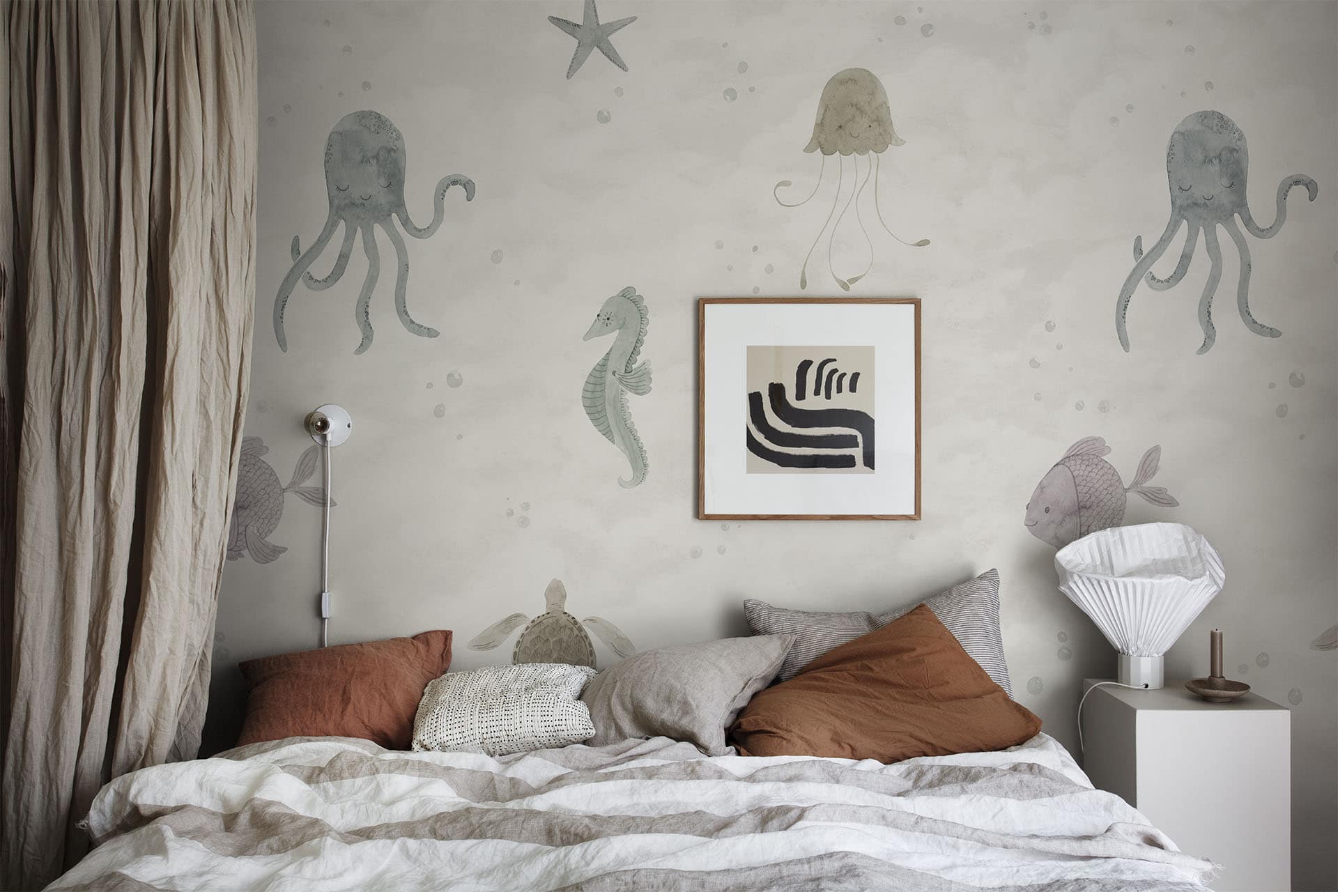 Mural Sandberg Familj II Alice 652-45 Confetti to prawdziwa podróż w głąb oceanu, gdzie każdy szczegół opowiada historię morskiego świata pełnego uroku i magii. Urocze ośmiornice, żółwie morskie, meduzy i ryby unoszą się wśród muszli, morskich gwiazd i falujących wodorostów, tworząc kompozycję, która zachwyca dziecięcą fantazją. Motyw jest wynikiem współpracy z 7-letnią Dellą, która z entuzjazmem pomogła wybrać zwierzęta, dając wzorowi autentyczność i dziecięcą radość. Dekoracja wprowadza do pokoju delikatną kolorystykę i lekką dynamikę, przemieniając wnętrze w najsłodszy podwodny świat. Doskonała do dziecięcych przestrzeni, zachęca do odkrywania, pobudza wyobraźnię i tworzy atmosferę przygody w otoczeniu oceanu. Mural Sandberg 652-45 Familj II Della Confetti to także element budujący marzycielską przestrzeń, w której dzieci mogą śnić, bawić się i tworzyć swoje własne podwodne historie.