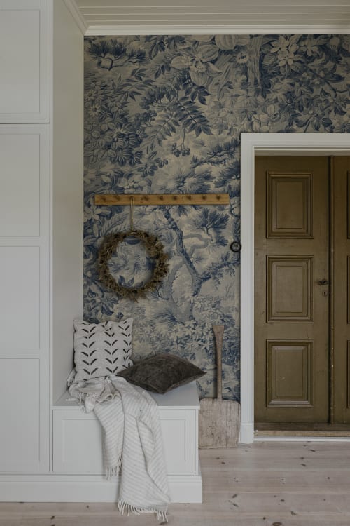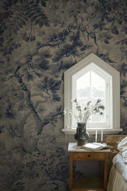 Mural Sandberg Tradgarden Johannas Damm S10512 Blue otwiera przed wnętrzem wizję bujnego, leśnego ogrodu, gdzie natura tworzy malarską scenerię pełną detali i subtelnych przejść tonalnych. Wzór ukazuje idylliczny krajobraz z ukrytym wśród roślinności stawem, przywołując atmosferę nostalgicznych ogrodów otoczonych dziką przyrodą. Delikatna faktura nadaje dekoracji wrażenie tkaniny, wprowadzając do przestrzeni miękkość i głębię. Efekt subtelnego cieniowania podkreśla bogactwo florystycznych elementów, co sprawia, że wzór zdaje się płynnie stapiać z otoczeniem. Mural Sandberg S10512 Tradgarden Johannas Damm Blue doskonale odnajduje się w klasycznych oraz eklektycznych aranżacjach, a sam wzór otula wnętrze naturalnym rytmem.