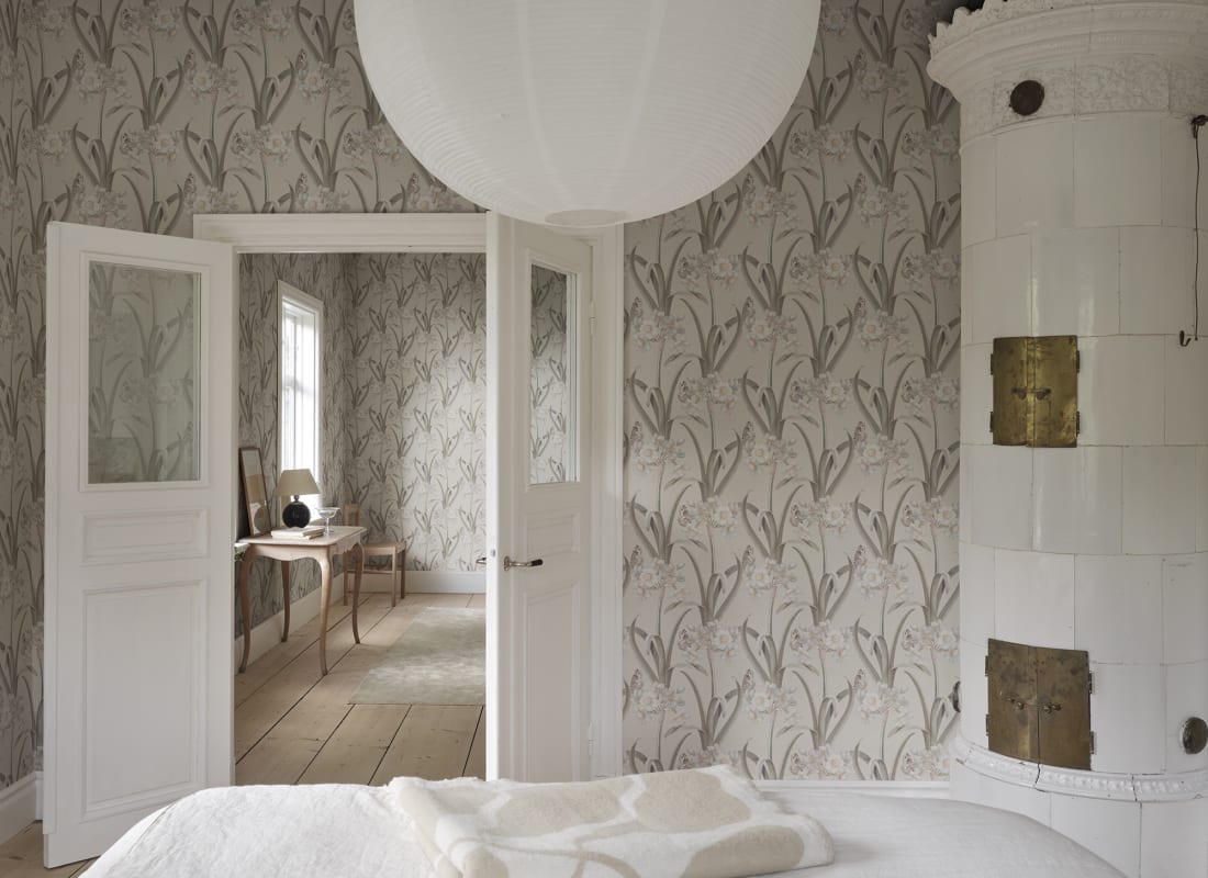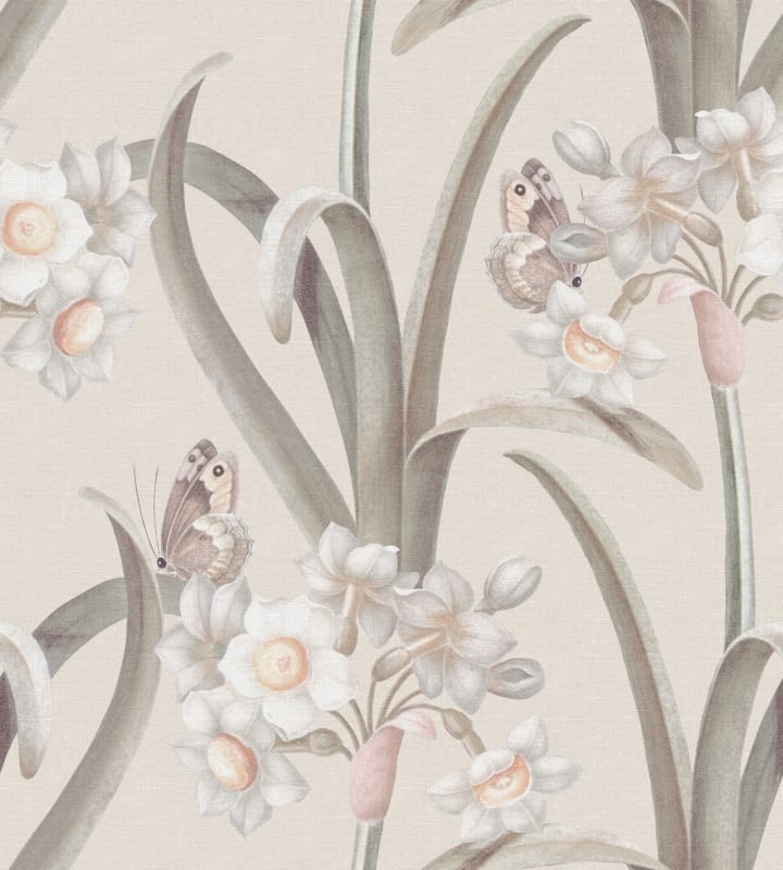 Mural Sandberg S10602 Herbarium Lilian Pastel reinterpretuję estetykę dawnych ekslibrisów, przenosząc botaniczny rysunek w przestrzeń miękkiego, świetlistego koloru. Subtelnie nakreślony narcyz poety o smukłych płatkach i filigranowych łodygach rozpościera się na tle w delikatnych tonacjach bieli, pudrowego różu i zgaszonej mięty, budując wrażenie lekkości, jakby wzór został zatrzymany w połowie gestu. Grafika odznacza się liniową finezją i ilustracyjną precyzją, wpisując się w tradycję florystycznych kompozycji o literackim charakterze. Mural Sandberg Herbarium Lilian S10602 Pastel działa jak eteryczna dekoracja – wyważona, nieprzytłaczająca, a jednocześnie nasycona wizualną treścią.