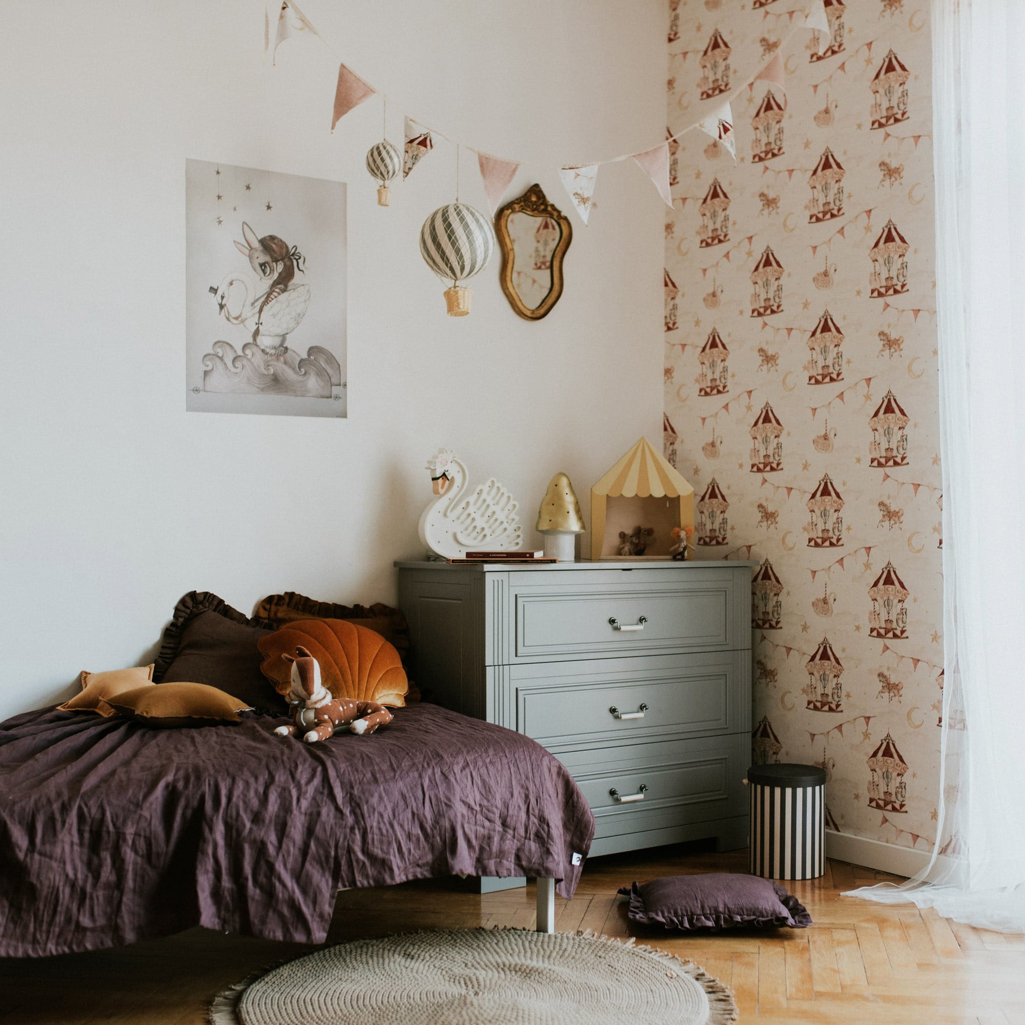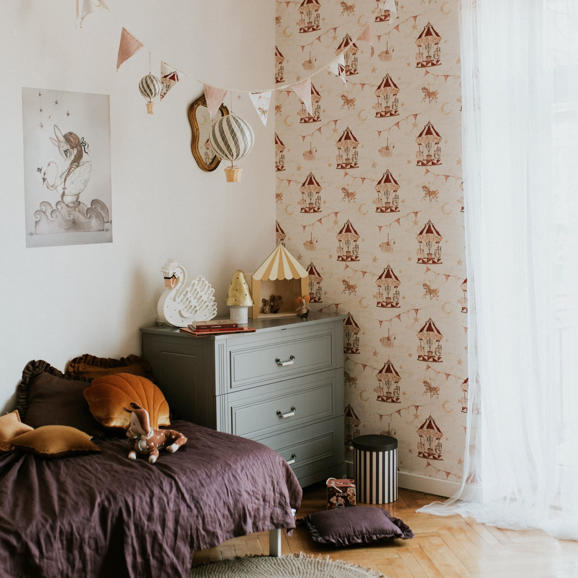Tapeta Dekornik Magiczna Karuzela DEKO.TAP.118 proponuje ponadczasowy wzór karuzeli, który wprowadzi do wnętrza zabawną i radosną atmosferę. Zdecydowanie jest to jedna z najpiękniejszych propozycji do pokoju najmłodszych pociech. Dziecięca tapeta w karuzele została utrzymana w stonowanej, beżowej kolorystyce, dzięki czemu sprawdzi się zarówno w pokoju dziewczynki, jak i chłopca. Tapeta Dekornik Magiczna Karuzela DEKO.TAP.118 podzielona jest na pasy (bryty) stworzone z połączenia papieru i flizeliny.
