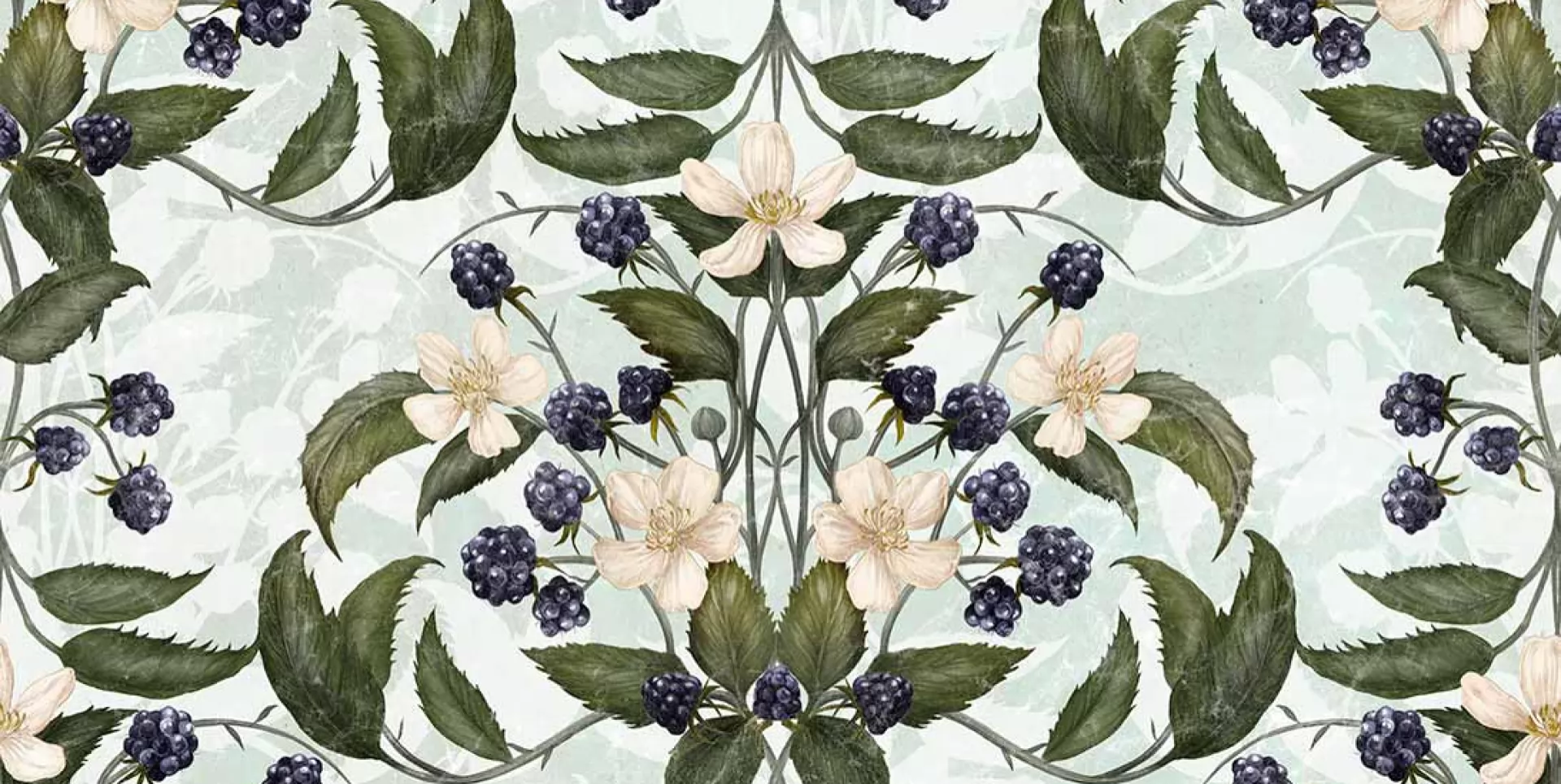 Mural Tecnografica Old London Rubus Blackberries 76749-2 ukazuje botaniczny wzór oparty na lustrzanym układzie roślin, który wprowadza do wnętrza spójność i rytm. Gałązki z kwiatami i owocami jeżyn tworzą gęstą, ale czytelną siatkę, inspirowaną klasycznymi grafikami przyrodniczymi. Kompozycja zachowuje naturalne proporcje, wzmacniając wrażenie porządku i symetrii. Realistyczna kreska współgra z dekoracyjnym układem, łącząc cechy ilustracji botanicznej i ornamentu ornamentalnego. Roślinne elementy rozmieszczone są precyzyjnie, dzięki czemu mural subtelnie przyciąga uwagę, nie dominując przestrzeni. Mural Tecnografica 76749-2 Old London Rubus Blackberries wpisuje się w stylistykę wnętrz inspirowanych klasyką, naturą i powtarzalnym rytmem.