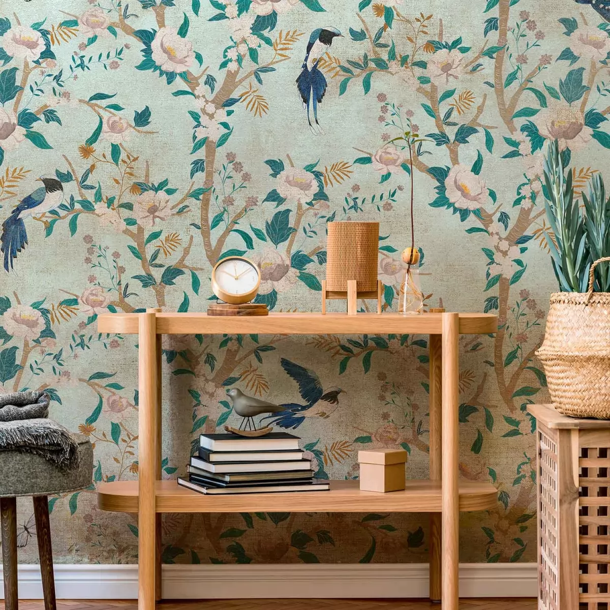 Mural Tecnografica Old London Sonet Encre 76880-4 prezentuje klasyczną kompozycję przyrodniczą w dekoracyjnej, zrównoważonej formie. Na powierzchni przypominającej tkaninę rozwijają się gałęzie z drobnymi liśćmi i kwiatami, uzupełnione sylwetkami ptaków. Styl wzoru nawiązuje do dawnych ilustracji botanicznych i dalekowschodnich dekoracji ściennych, jednak całość została przekształcona w uproszczoną, graficzną kompozycję. Mural Tecnografica 76880-4 Old London Sonet Encre doskonale uzupełni klasyczne i romantyczne wnętrza, wprowadzając delikatną ozdobność i wyciszony, roślinny motyw w ponadczasowym stylu.