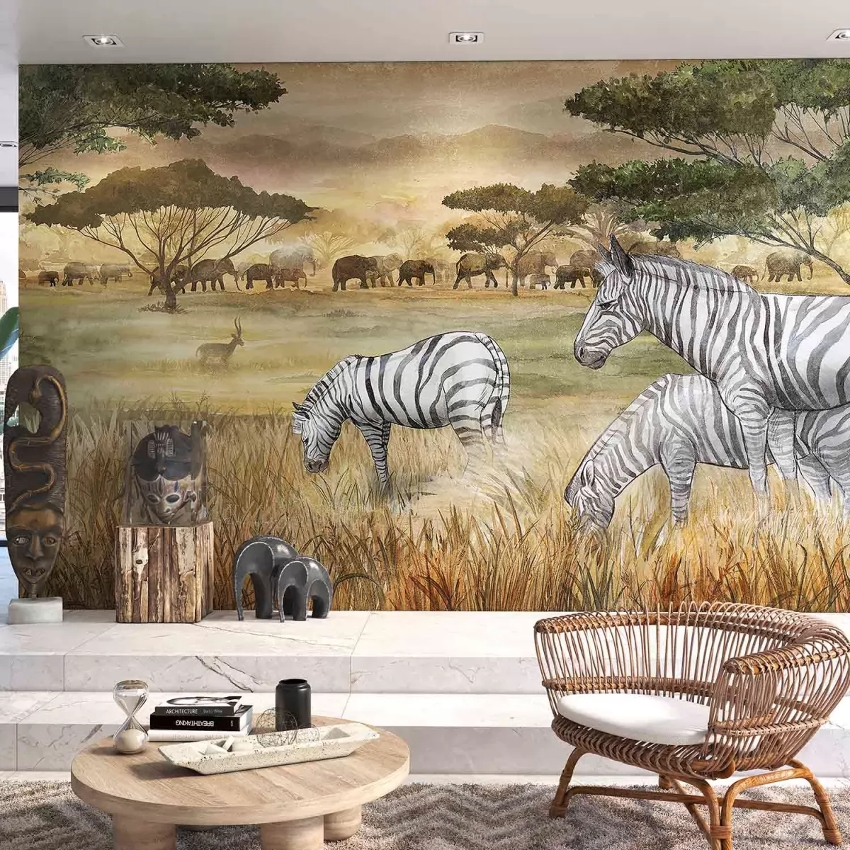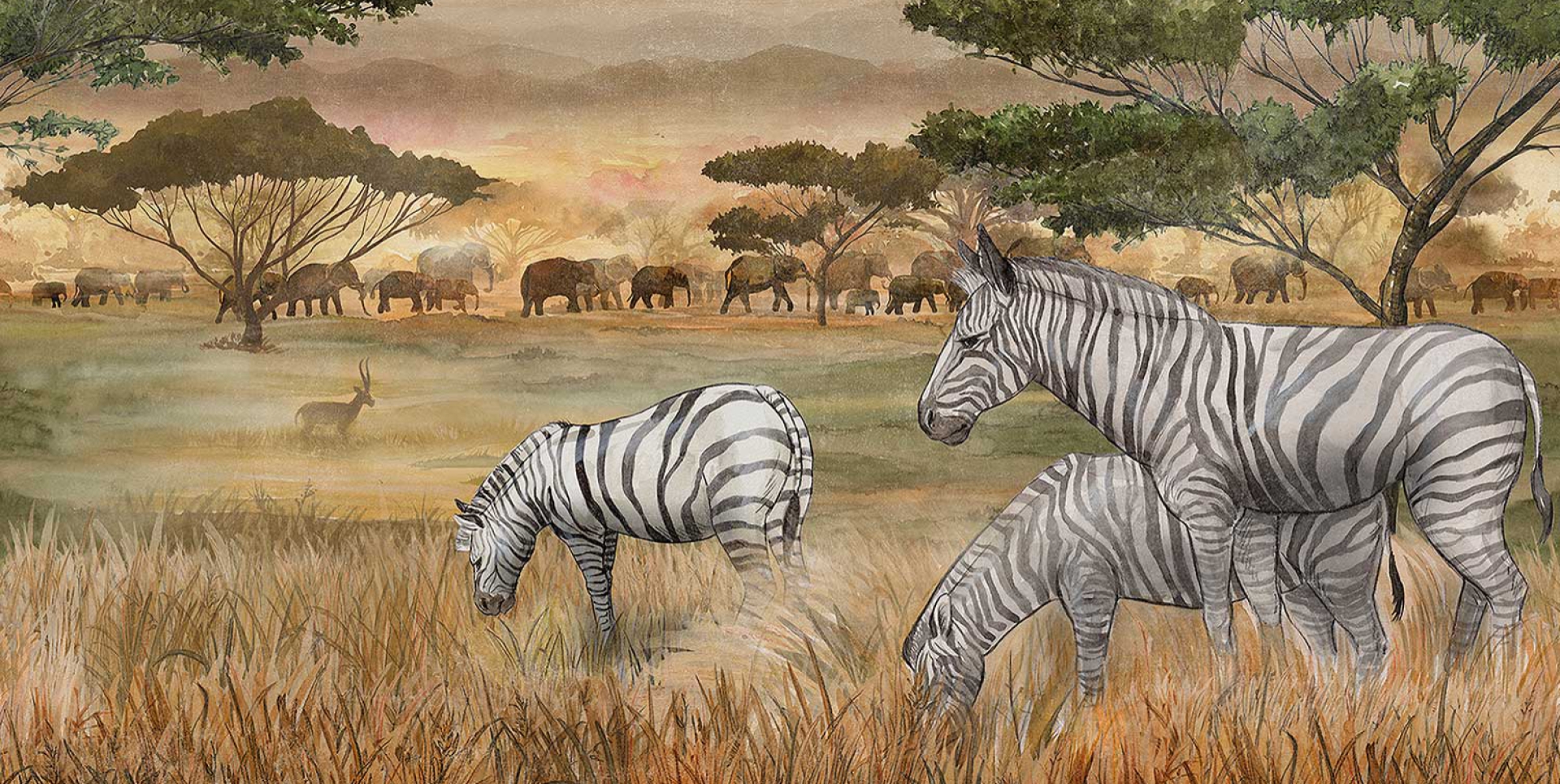 Mural Tecnografica Expedition Savana 77481-1 przedstawia majestatyczny krajobraz afrykańskiej sawanny, w którym zebry, antylopy i słonie wpisują się w malarską panoramę. Kompozycja łączy ilustracyjną precyzję z impresyjnym tłem, tworząc wielowarstwową narrację natury i spokoju. Horyzontalny układ pejzażu optycznie poszerza przestrzeń, a rytmiczne rozmieszczenie sylwetek zwierząt wprowadza do wnętrza dynamikę i równowagę. Wzór harmonizuje z naturalnymi materiałami, takimi jak surowe drewno, len, rattan czy ceramika o ziemistej fakturze. Doskonale komponuje się z aranżacjami w stylu etnicznym, kolonialnym i boho, gdzie estetyka podróży spotyka się z wyrafinowanym detalem. Mural Tecnografica 77481-1 Expedition Savana zamienia ścianę w opowieść o dzikiej przyrodzie i ponadczasowym pięknie natury.