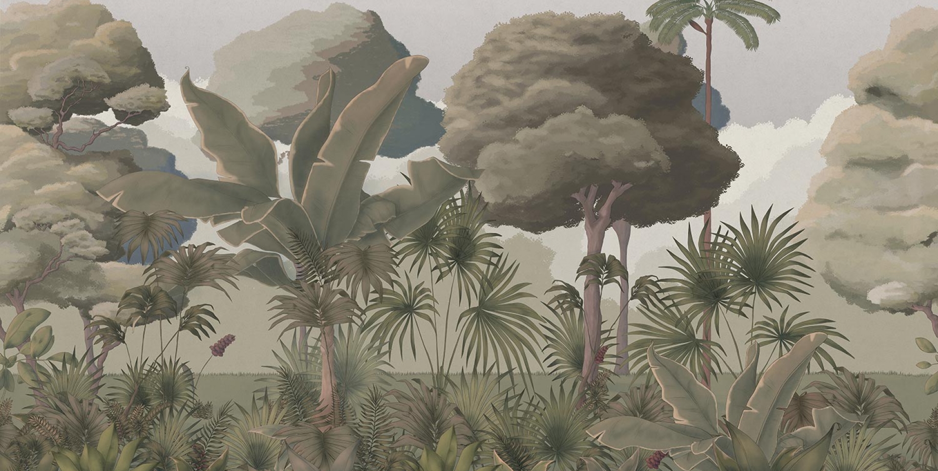 Mural Tecnografica Expedition Mori Green No Birds 85566-4 ukazuje bujny krajobraz tropikalny, w którym gęsto rozmieszczone rośliny tworzą warstwową kompozycję o wyciszonym, panoramicznym charakterze. Wzór opiera się na zestawieniu liści o wyrazistych konturach z kojącą bazą, co nadaje ścianie głębi i rytmu. Brak elementów fauny potęguje wrażenie ciszy, a jednocześnie wzmacnia kontemplacyjny wymiar całej sceny. Mural sprawdza się w aranżacjach inspirowanych stylem japandi, naturalizmem oraz nowoczesną wersją tropical modern, gdzie staje się wyrafinowanym tłem budującym atmosferę wnętrza. Harmonizuje z wapiennym tynkiem, drewnem o ciepłym wybarwieniu, szorstkim lnem i ceramiką o surowej strukturze. Mural Tecnografica 85566-4 Expedition Mori Green No Birds porządkuje przestrzeń, a jednocześnie nadaje jej głębi i miękkości.