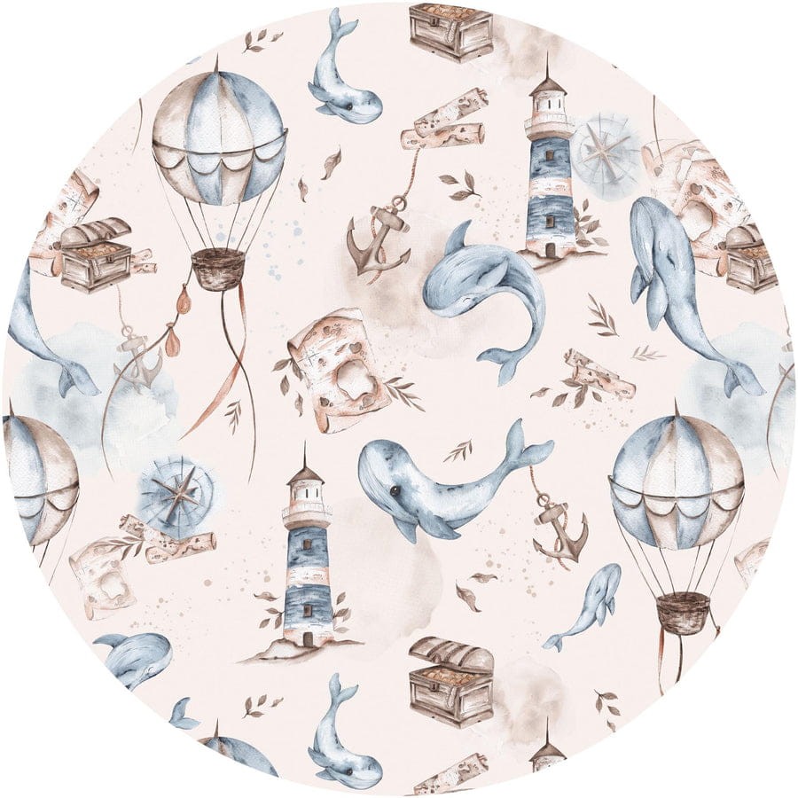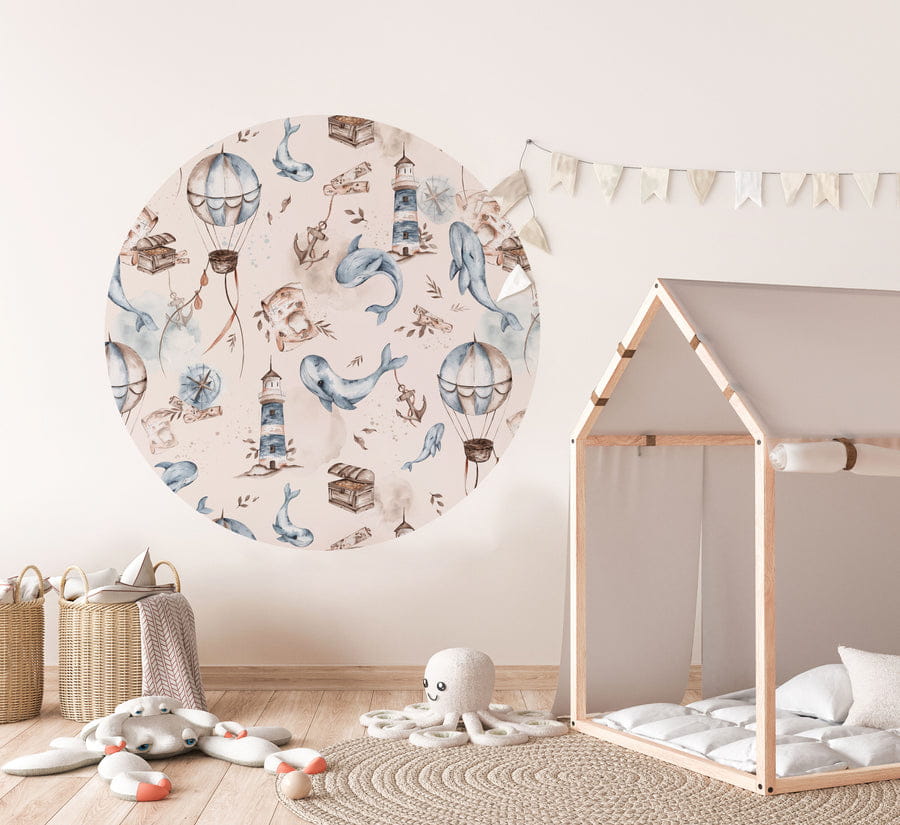 Mural Koło Wall Art Baleno łączy motyw morski z unoszącymi się balonami. Wieloryby, lateranie morski i skrzynie pełne skarbów na pierwszy rzut oka nie mają nic wspólnego z balonami. Jednak autorka, Paula Poprawka, postanowiła zestawić siłę powietrza, która umożliwia wznoszenie się balonów, z podwodnym światem pełnym tajemnic. Dzięki temu ten wzór jest niebanalny i skupia na sobie uwagę. Przez wykorzystanie przygaszonej, stonowanej palety barw projekt nie przytłacza i z łatwością można wkomponować go w minimalistyczne przestrzenie. Pasuje do białych mebli lub tych utrzymanych w drewnianej estetyce. Idealnie połączy się ze wszystkimi zabawkami, również tymi w krzykliwych kolorach. Wall Art Baleno - mural koło dla dzieci w morski motyw i balony jest nie tylko piękny, ale także praktyczny. Jego montaż odbywa się za pomocą samoprzylepnej warstwy - nie ma więc mowy o kupowaniu dodatkowo kleju i męczeniu się z równomierną instalacją. W dodatku można go przykleić nie tylko na ścianę, ale również na inne gładkie powierzchnie, takie jak lustra czy fronty mebli.