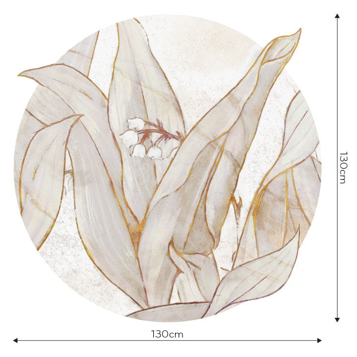 Mural Koło Wall Art Lirio został zainspirowany pięknem natury, o której w codziennym pędzie zdarza nam się zapominać. Projekt przedstawia okazałe, beżowe liście konwali o złotych konturach, z których nieśmiało wychylają się subtelne dzwoneczki. Kwiat ten kojarzy nam się z późną wiosną, jest symbolem szczęścia, młodości, niewinności i skromności. Delikatny wzór w kremowych i beżowych barwach ze złotymi akcentami nada każdemu wnętrzu przytulności, ale również elegancji. Motyw wprowadzi do pomieszczenia dużą dawkę pozytywnej energii. Wykorzystanie we wnętrzu dekoracji ściennej z motywem roślinnym przybliża człowieka do świata przyrody, która koi i wycisza. W dodatku niebanalna forma koła wnosi do mieszkań nowoczesny i designerski pierwiastek. Wall Art Lirio - mural koło w konwalie w graficznym stylu jest również bardzo łatwy w montażu. Dzięki temu, że jest samoprzylepny, instaluje się go bez użycia kleju, co niesamowicie usprawnia cały proces.
