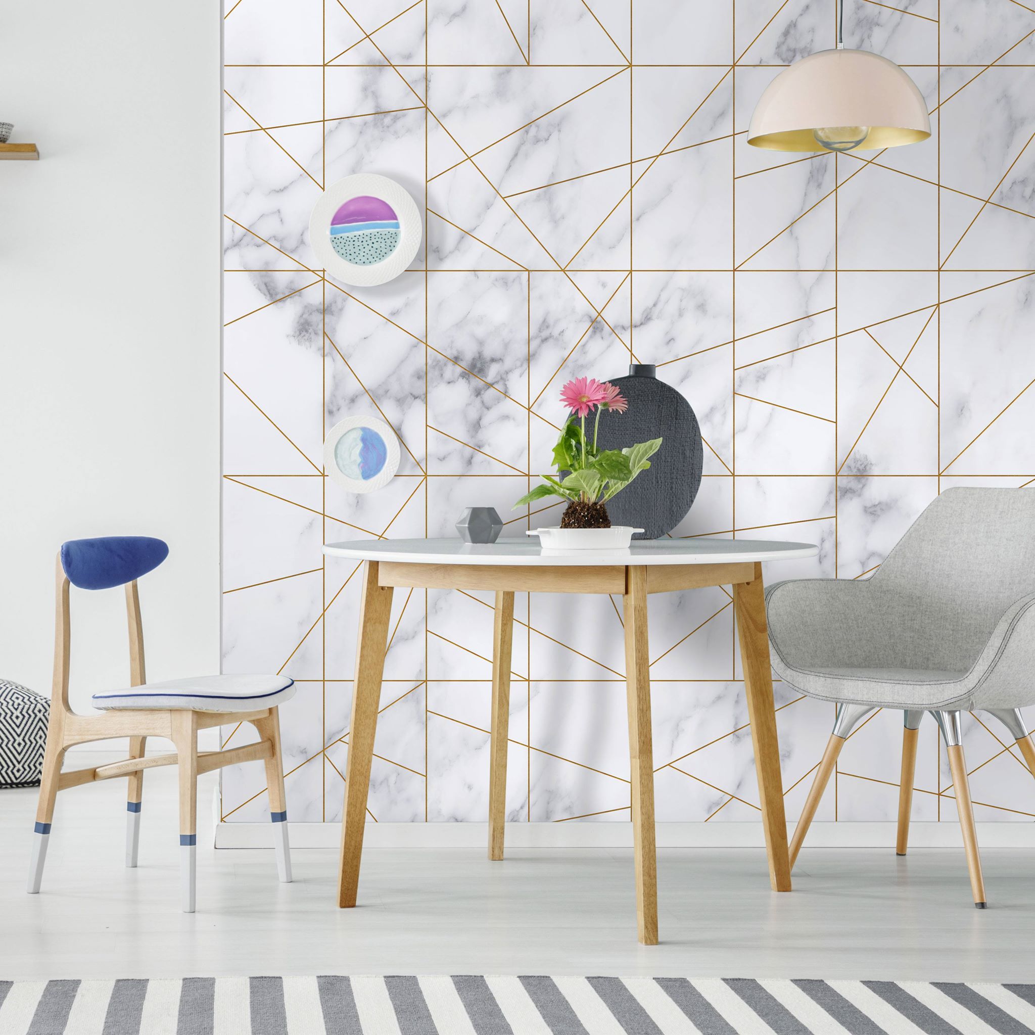 Mural Wall Art Originals Marble Veins Gold przedstawia geometryczne i nowoczesne, złocone kształty na marmurowym tle. Ten ciekawy projekt wprowadzi do wnętrza dużą dawkę klasy i nowości z domieszką romantyzmu. Wzór Marble Veins Gold z kolekcji murali Wall Art Originals wspaniale odnajdzie się w towarzystwie klasycznych dodatków i nowoczesnych rozwiązań. Z powodzeniem możesz zamontować go na ścianie eklektycznego salonu lub na ścianie za łóżkiem współczesnej sypialni.
