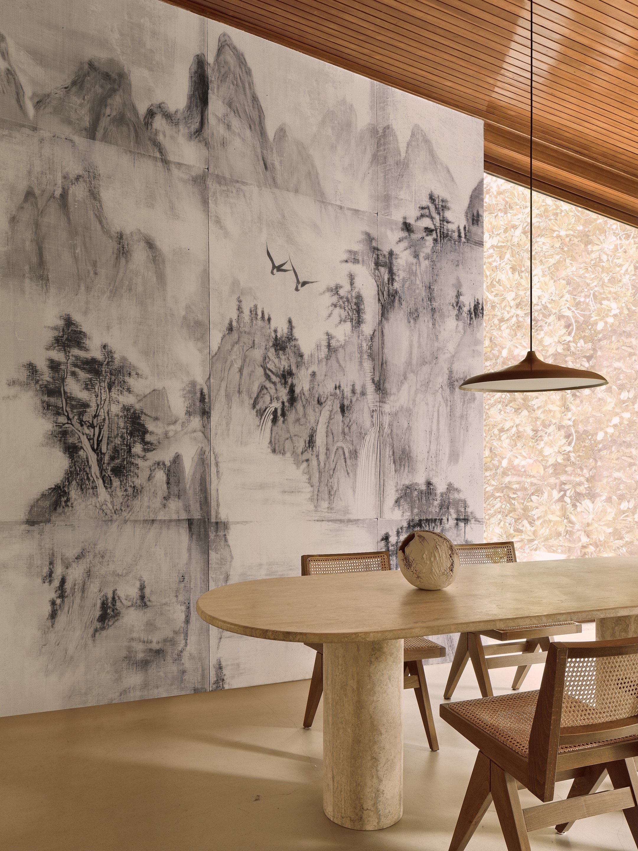Mural Wall & Deco WDMM2501 Contemporary 2025 Morning Mist przenosi nas w świat delikatnych, eterycznych pejzaży inspirowanych klasycznym malarstwem dalekowschodnim. Majestatyczne góry wyłaniają się z lekkiej mgły, tworząc kompozycję pełną subtelności i przestrzennej głębi. Smukłe drzewa o misternie zarysowanych gałęziach budują rytm kompozycji, a spokojna tafla wody odbija otaczający krajobraz, wzmacniając wrażenie harmonii i kontemplacji. W tle unoszą się ptaki, które wprowadzają do sceny delikatny, niemal medytacyjny ruch. Wzór przypomina tradycyjne malowidła tuszem lub akwarelą, gdzie miękkie przejścia tonalne i półprzezroczyste warstwy podkreślają ulotność natury. Mural Wall & Deco Contemporary 2025 WDMM2501 Morning Mist doskonale komponuje się z wnętrzami inspirowanymi japońskim minimalizmem, klasycznym orientem oraz nowoczesnym designem, w którym liczy się wyważona estetyka i subtelna gra światła.