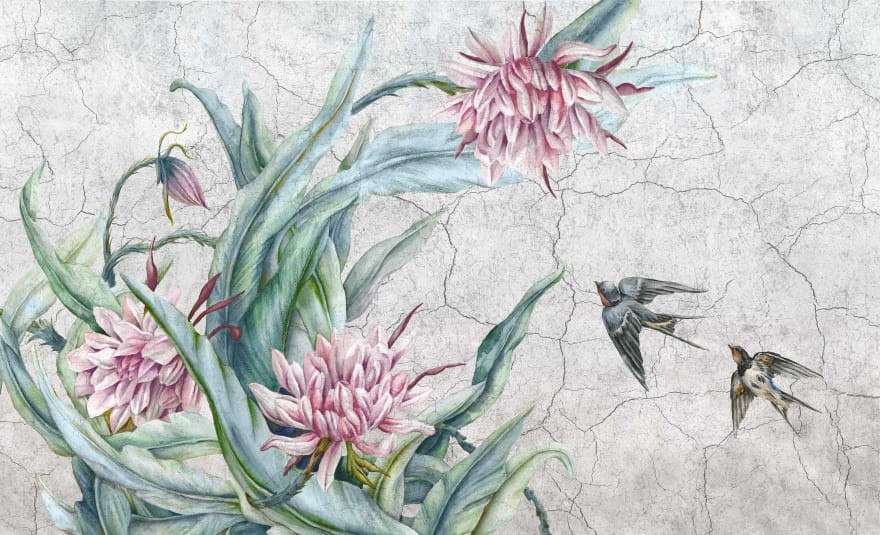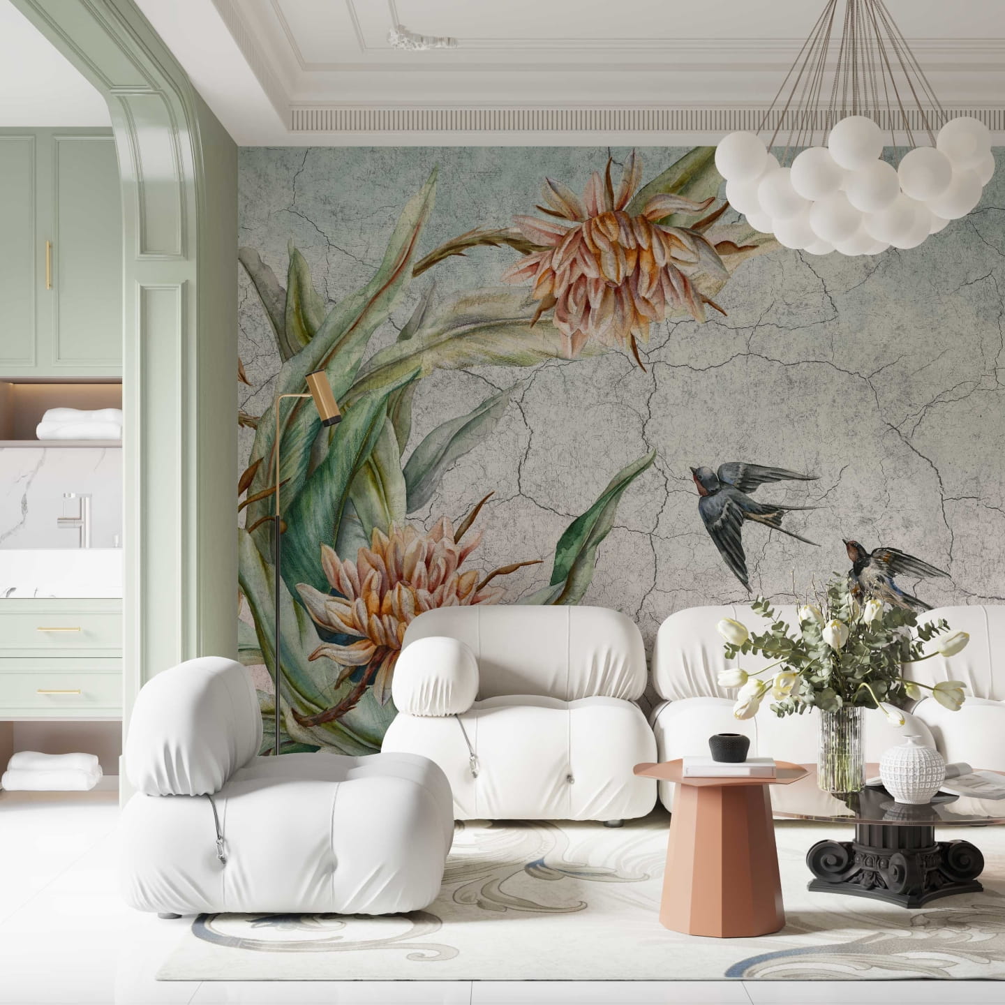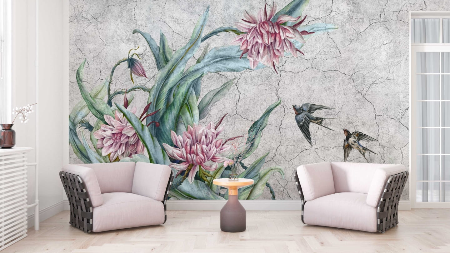 Wall & More 2461 21A Primavera - mural w rośliny i ptaki na surowym tle