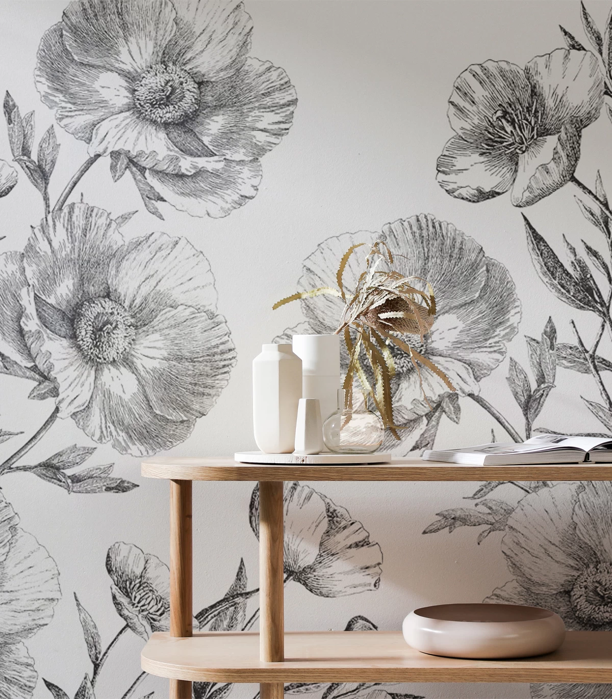Mural Wallcolors Life in Boho Poppy to imponująca ozdoba ścienna o bardzo naturalnym charakterze. Projekt przedstawia szkic romantycznych bukietów urokliwych maków na białym tle. Motyw może zostać wydrukowany na wielu materiałach i teksturach, na przykład samoprzylepny materiał wallsticker, sprawia, że możesz w szybki sposób zmieniać miejsce zamontowania ozdoby, natomiast tekstura Smooth na flizelinie nadaje tapecie efekt jedwabistej gładkości. Z kolei tekstura Sand na flizelinie ma strukturę grubego piasku z efektem delikatnego błyszczenia, a faktura Canvas imituje grube płótno malarskie. Do wyboru mamy jeszcze materiał Concrete przypominający strukturę betonu oraz fakturę Raindrop imitującą spływające pionowo, błyszczące krople deszczu. Mural Wallcolors Life in Boho Poppy wspaniale odnajdzie się w towarzystwie klasycznych dodatków i nowoczesnych rozwiązań. Z powodzeniem możesz zamontować go na ścianie eklektycznego salonu lub na ścianie za łóżkiem współczesnej sypialni. Model dostępny jest w trzech rozmiarach do wyboru: 100x200, 100x250 lub 100x300.