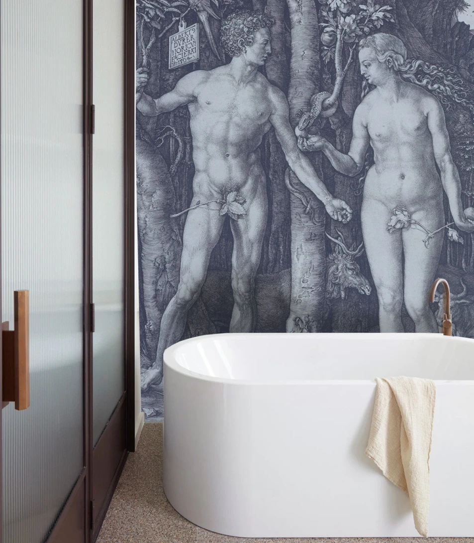 Mural Wallcolors Art Matters Forbidden Fruit TAP-9095 to dekoracja ścienna o symbolicznym charakterze inspirowana motywem ogrodu Eden. Kompozycja przedstawia biblijne postacie, Adama i Ewę, w otoczeniu bujnej roślinności. Stonowana paleta kolorystyczna czyni ten mural eleganckim i ponadczasowym elementem dekoracyjnym. Znakomicie prezentować będzie się na ścianie akcentowej w sypialni, jadalni czy kawiarni. Pasuje zarówno do nowoczesnych, minimalistycznych miejsc, jak i do eklektycznych, bardziej dekoracyjnych aranżacji. Dużą zaletą muralu Wallcolors Art Matters Forbidden Fruit TAP-9095 jest możliwość dostosowania go do potrzeb dekorowanego pomieszczenia. Rozmiar tego produktu można idealnie dopasować do wymiarów ściany. Masz również do wyboru kilka materiałów. Dostępne są odporne na zarysowania wersje winylowe o różnorodnych fakturach - m.in. płótna malarskiego czy betonu - oraz wariant Wallstick, który wyposażony jest w samoprzylepny spód, który usprawnia montaż. Niebanalne wzornictwo oraz możliwość personalizacji sprawiają, że mural Wallcolors Art Matters Forbidden Fruit stworzy zapadającą w pamięci i funkcjonalną oprawę wnętrza.