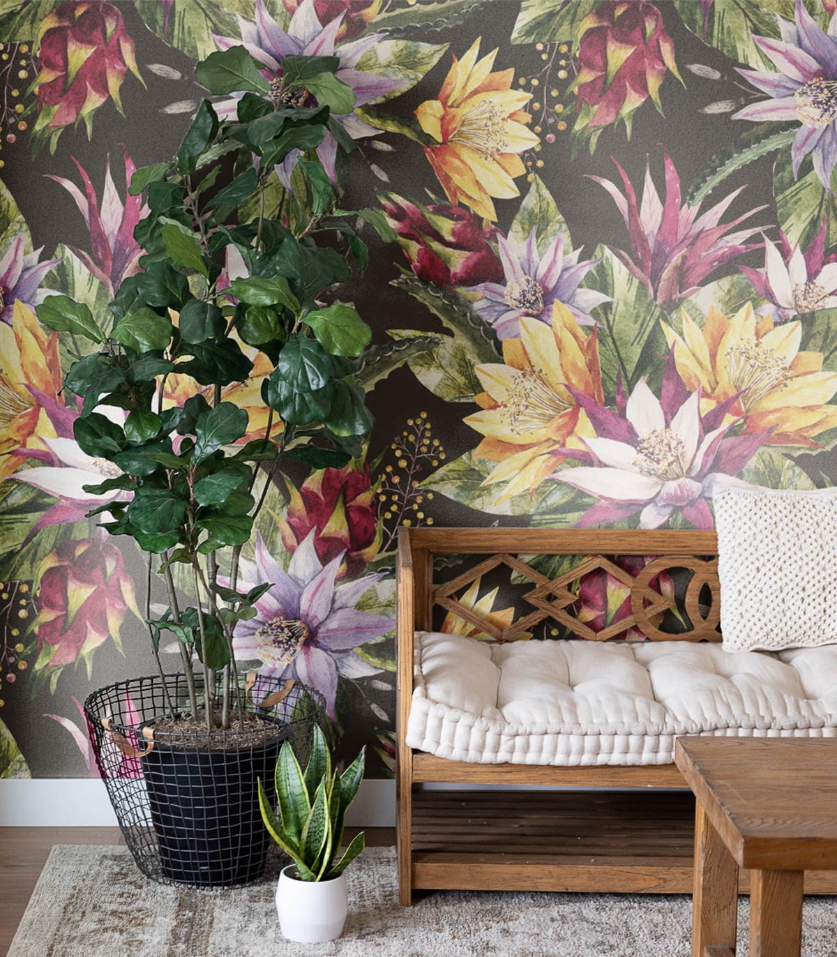 Mural Wallcolors Tropical Intense Tropical Flowers imponująca dekoracja, która tchnie w pomieszczenie dużo natury i koloru. Projekt przedstawia tropikalne, barwne kwiaty na nowoczesnym, czarnym tle. Motyw może zostać wydrukowany na wielu materiałach i teksturach, na przykład samoprzylepny materiał wallsticker, sprawia, że możesz w szybki sposób zmieniać miejsce zamontowania ozdoby, natomiast tekstura Smooth na flizelinie nadaje tapecie efekt jedwabistej gładkości. Z kolei tekstura Sand na flizelinie ma strukturę grubego piasku z efektem delikatnego błyszczenia, a faktura Canvas imituje grube płótno malarskie. Do wyboru mamy jeszcze materiał Concrete przypominający strukturę betonu oraz fakturę Raindrop imitującą spływające pionowo, błyszczące krople deszczu. Mural Wallcolors Tropical Intense Tropical Flowers będzie ciekawą propozycją na ozdobienie ściany akcentowej salonu, sypialni czy jadalni. Wzór doskonale odnajdzie się jako dodatek w klasycznych, nowoczesnych czy eklektycznych wnętrzach. Model dostępny jest w trzech rozmiarach do wyboru: 100x200, 100x250 lub 100x300.